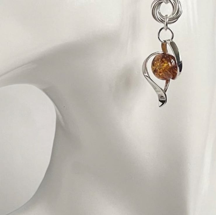 Sterling Silver Cognac Amber Chainmaille earrings.