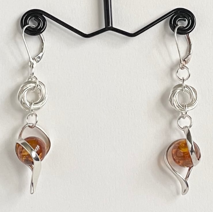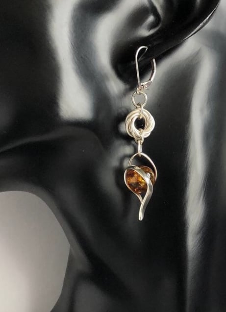 Stylish Sterling Silver Cognac Amber Drop earrings with interconnecting individual Sterling Silver rings hand woven into the mobius/vortex chainmaille pattern.