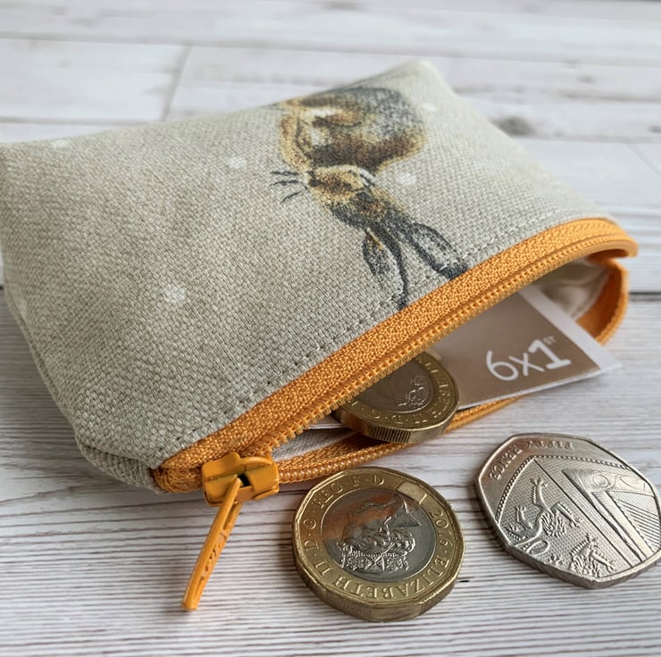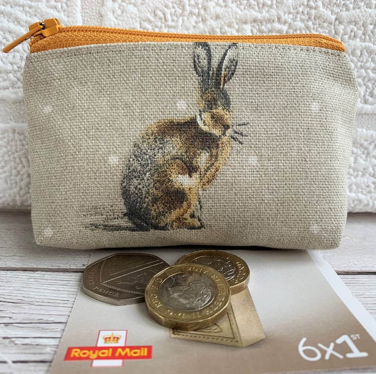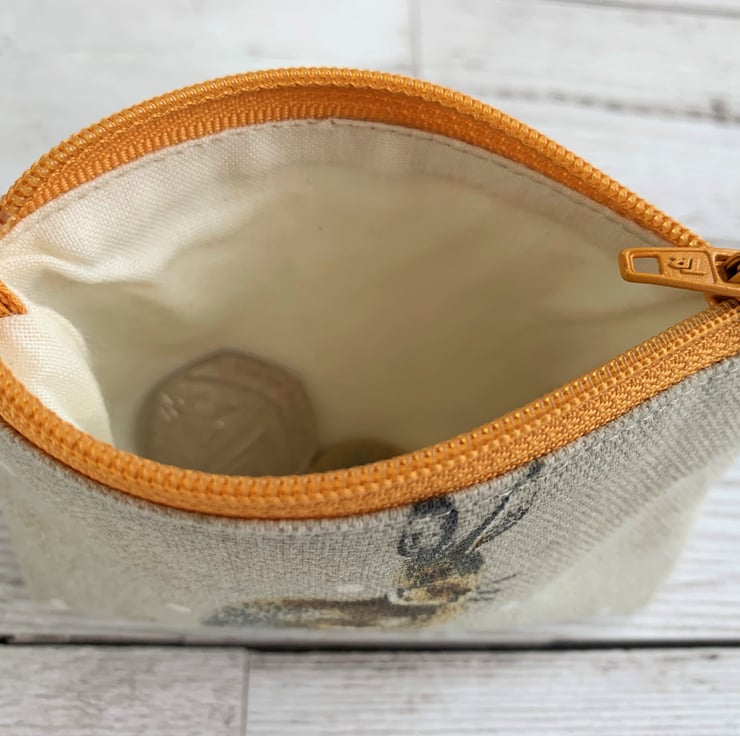 A small coin purse in a lovely print fabric featuring a hare. The pattern shows a brown hare on a beige background with white polka dots. The coin purse fastens with a golden yellow zip and is lined with cream fabric. The base of the purse is boxed to give more space inside.