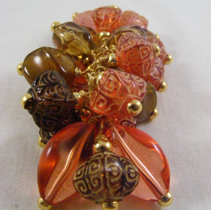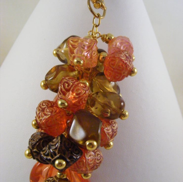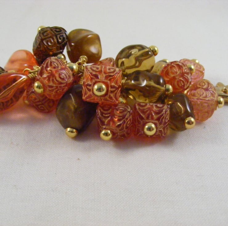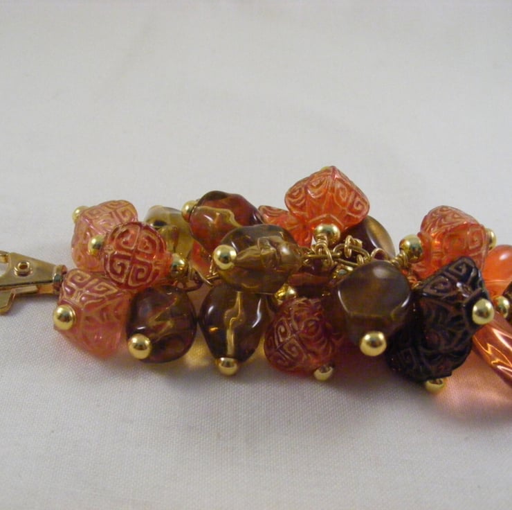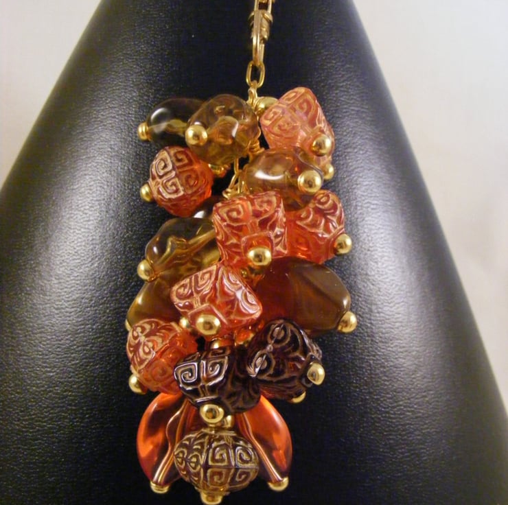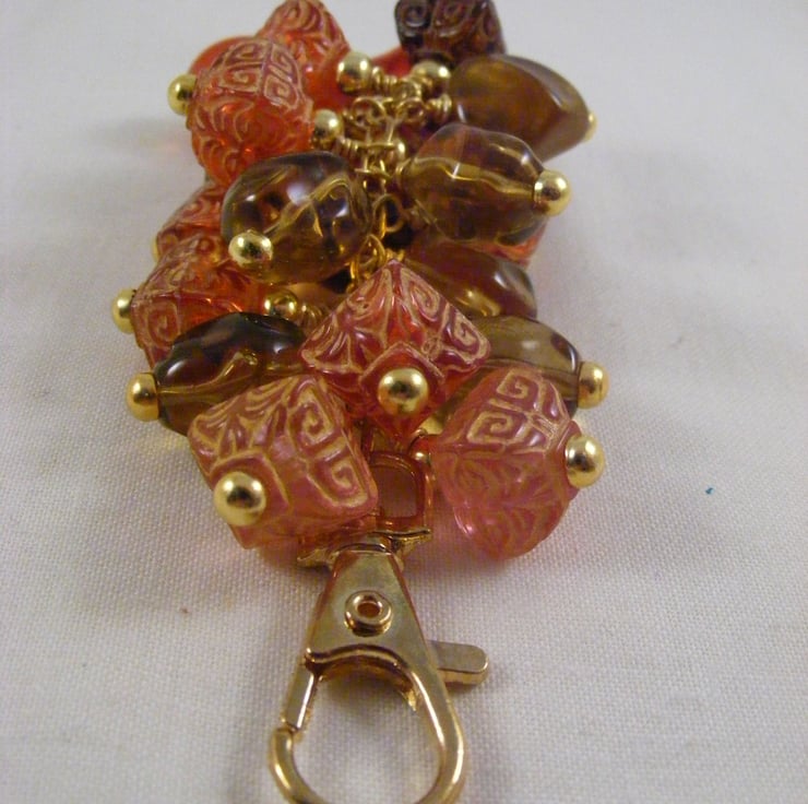 I've handmade this lovely bag charm using 23 x 15 mm orange acrylic ovals, 11 mm orange and brown acrylic patterned puffy square beads, 17 mm brown acrylic beads,