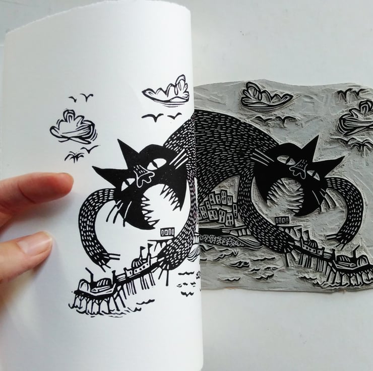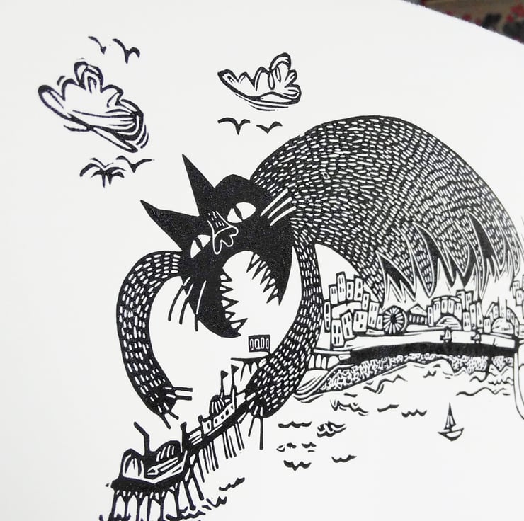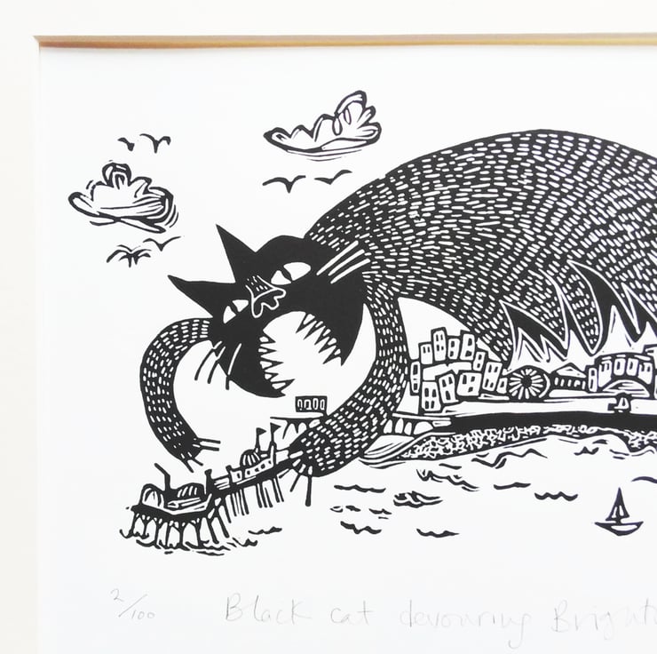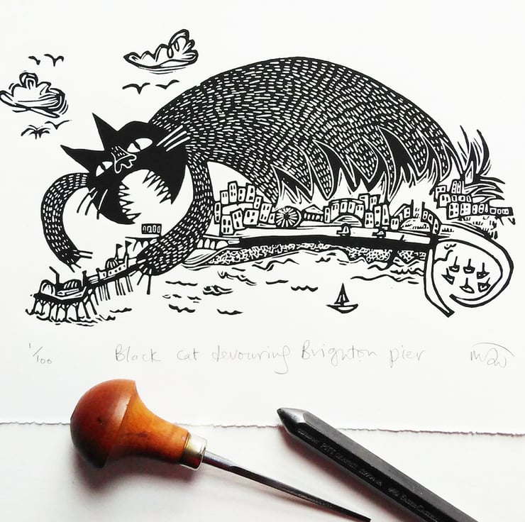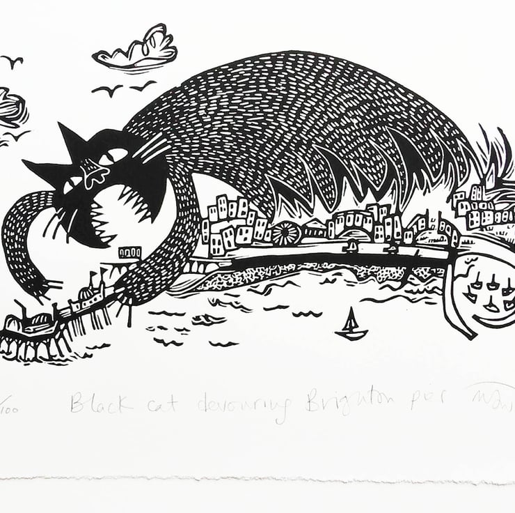 A hand burnished lino print picture of a naughty cat eating the pier in Brighton, East Sussex