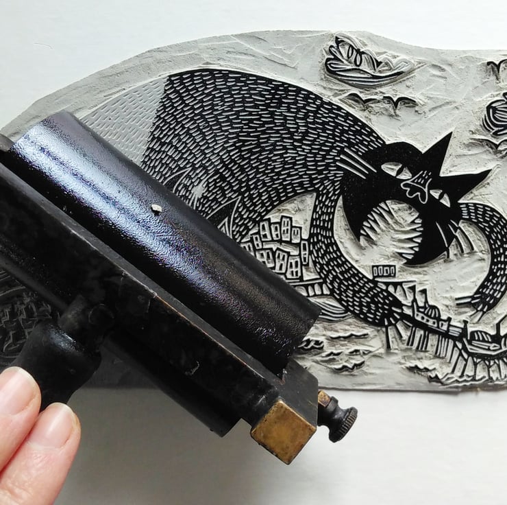 This image is from my original drawing, which I have then carved into a lino block and then hand burnished onto Somerset Satin paper (my favourite for lino prints). The image size is 12cm x 21cm.