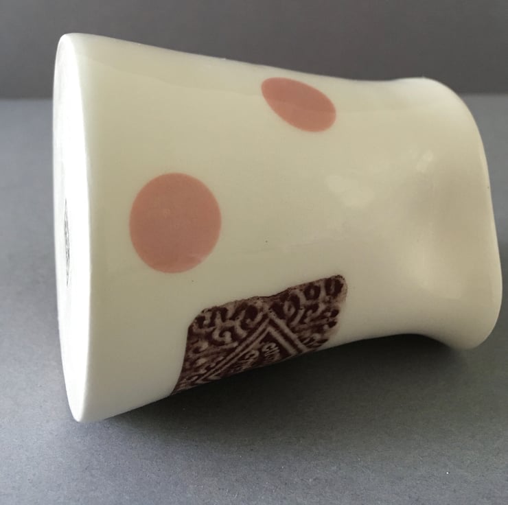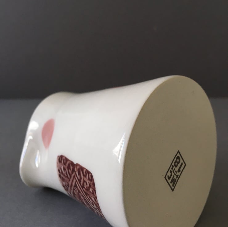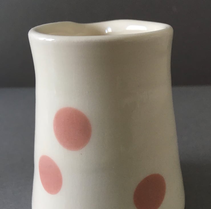 Cream/White earthenware ceramic milk jug. Handthrown on my little pottery wheel. Dipped in a transparent clear glaze. This cute size pourer has a custard cream biscuit decoration and baby pink polka dots.