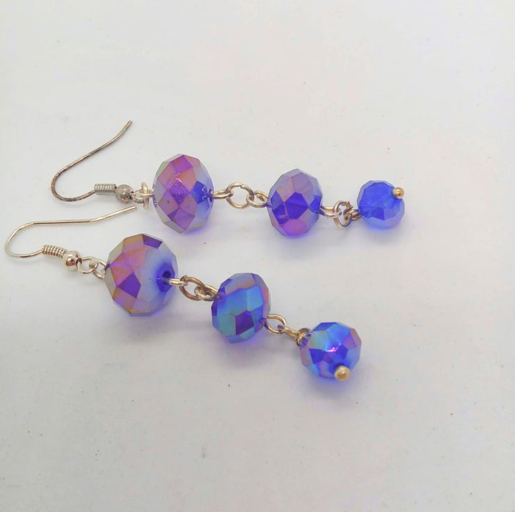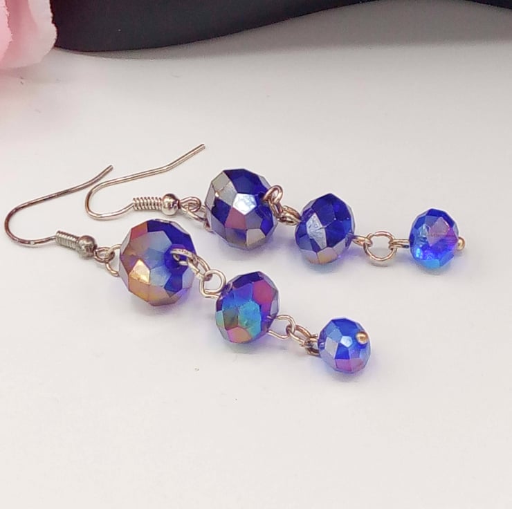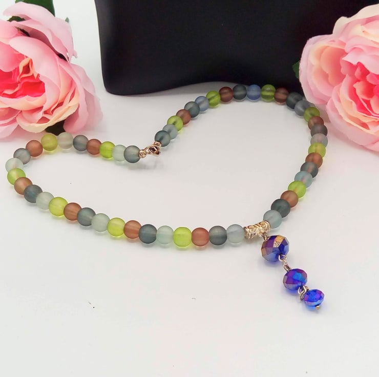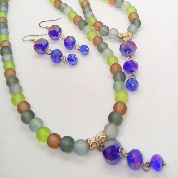 This very attractive jewellery set is made using 8 mm multi coloured dusky beads with a 12 mm 10 mm and 8 mm blue crystal rondelle bead in the centre of the necklace and bracelet, and for the earring drops. Both the Necklace and the Bracelet have a silver plated lobster clasp, and the earrings have silver plated ear wires.