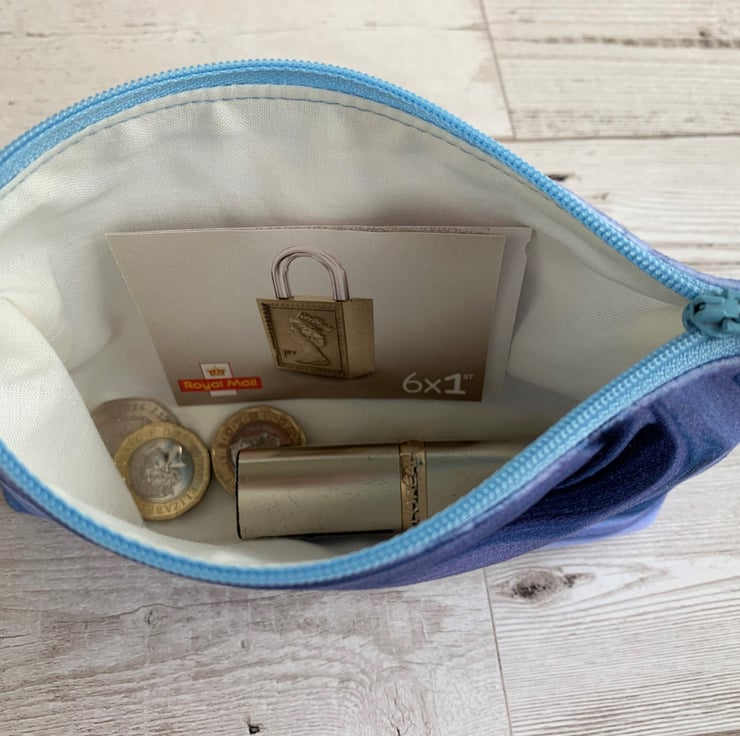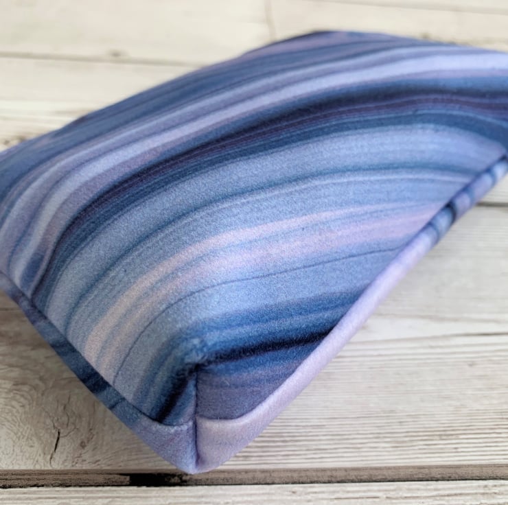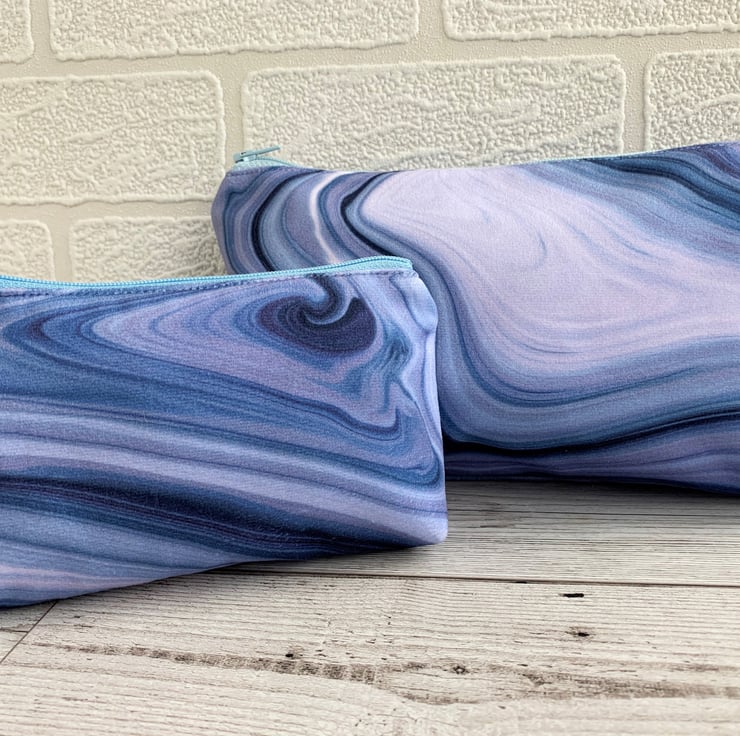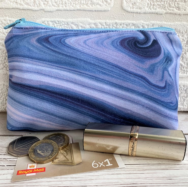 A large coin purse in a luxurious soft velvety fabric with a delightful swirled marbled pattern in shades of blue and lilac. The coin purse has a pale blue zip and is lined with cream fabric. The base of the purse is boxed to give more space inside.
