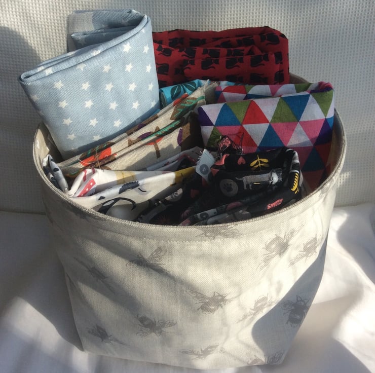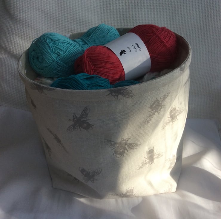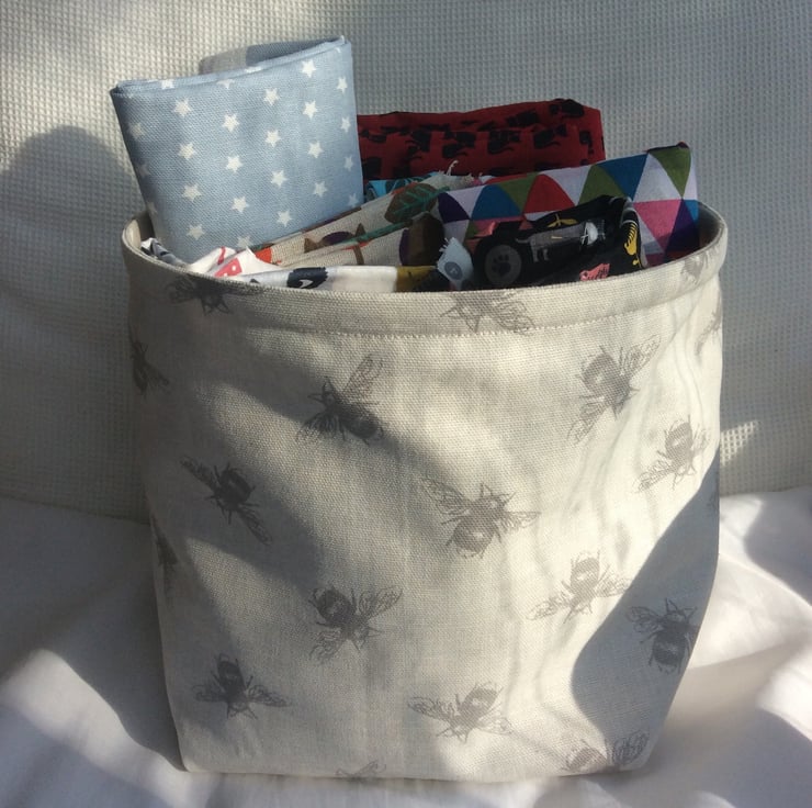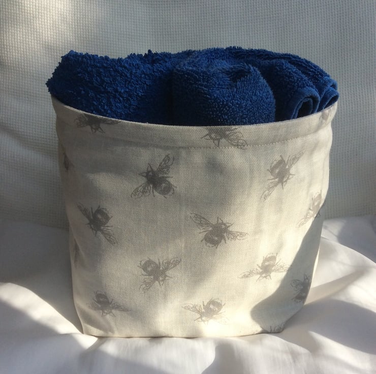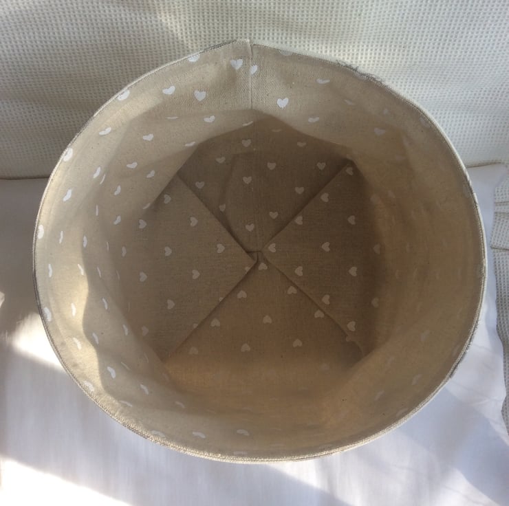 Fabric bowl/basket made using a beige, linen look cotton fabric with grey bees, with a matching lining with small white hearts.