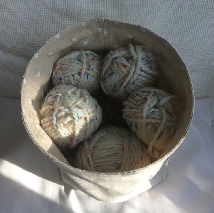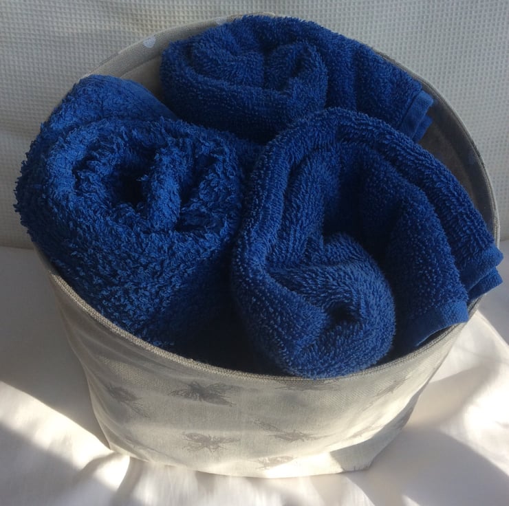 The basket is approximately 20cm high and 22cm in diameter and could be used to store a multitude of things ( except anything liquid!). It is perfect for storing fabric, yarn, craft projects, towels and it could even be used as a waste paper bin. Recycled plastic banding threaded in the rim helps maintain the shape of the basket.