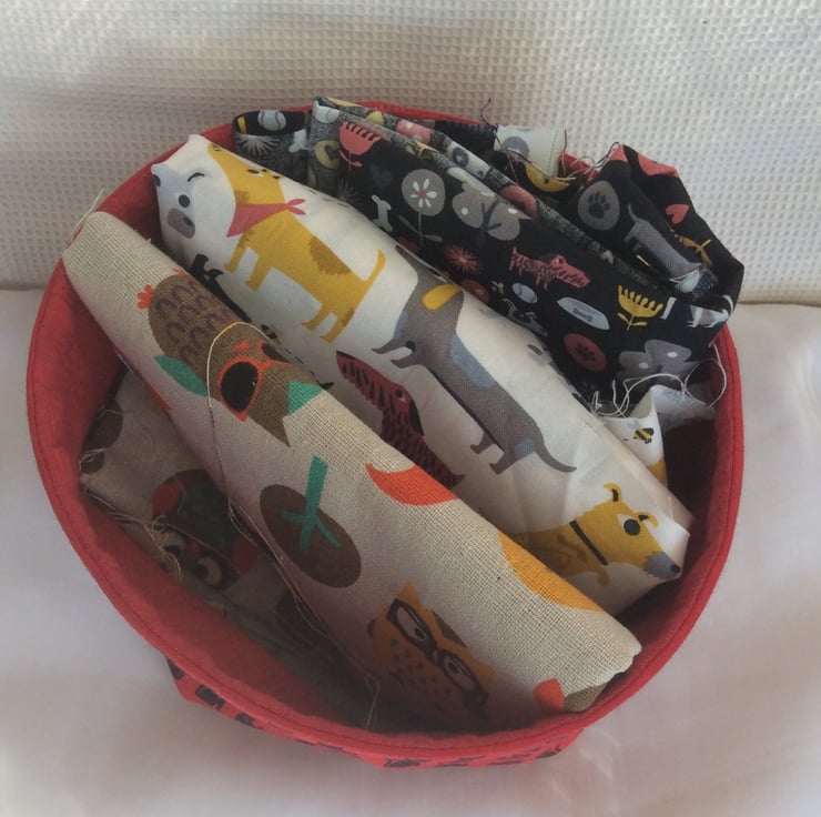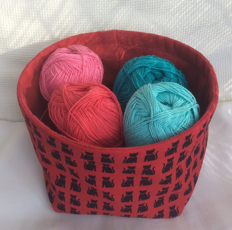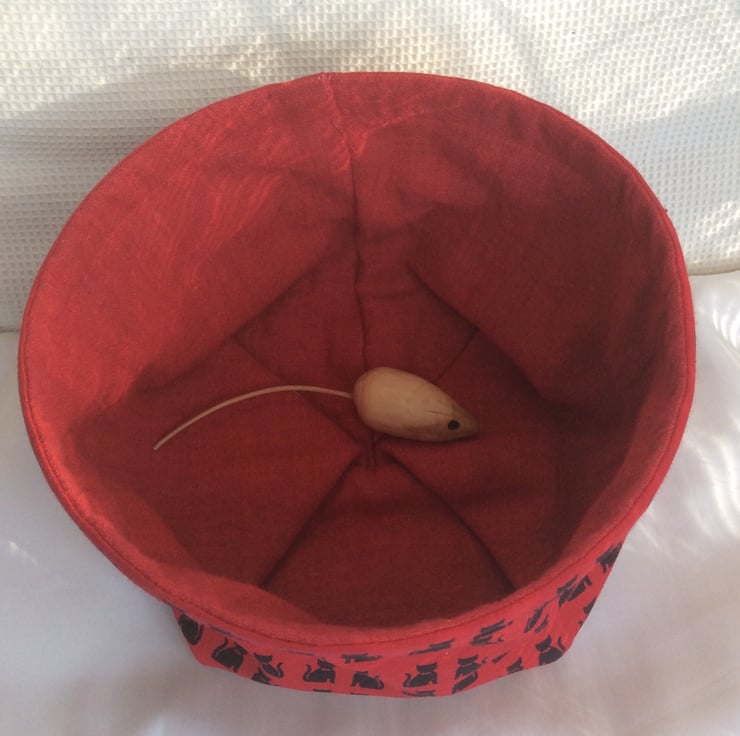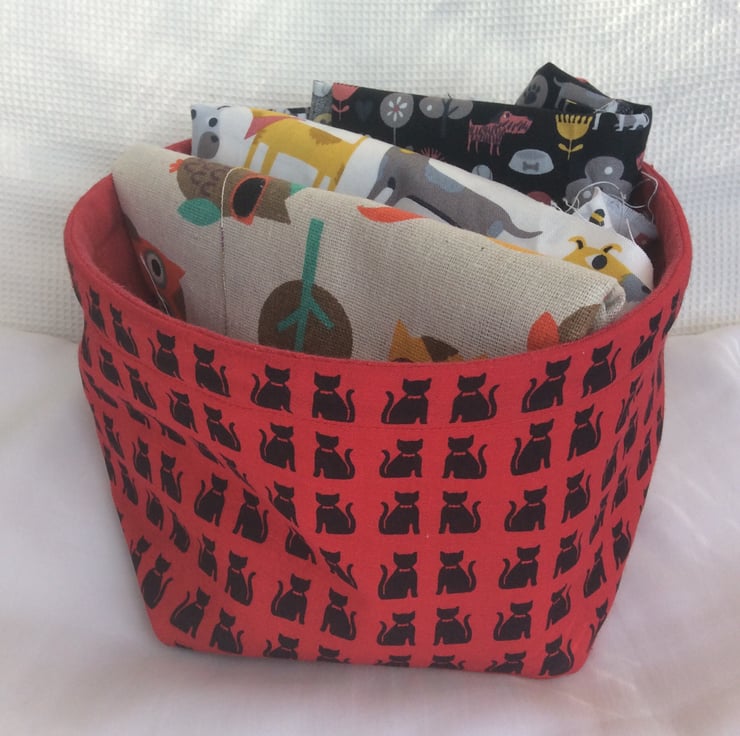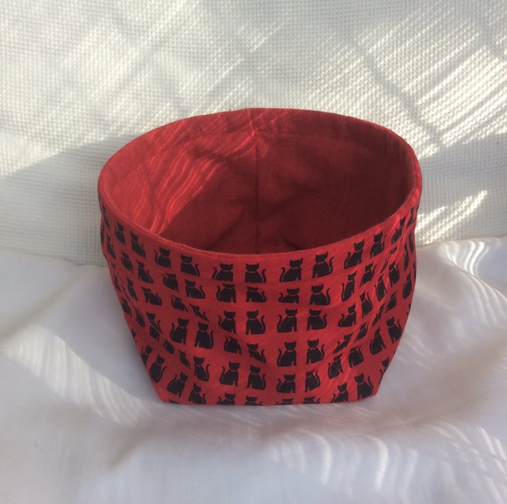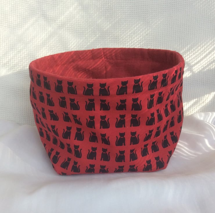 Fabric bowl/basket made using a red fabric with lots of black cats with a matching plain red lining.