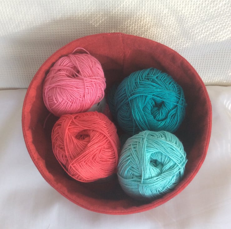 The basket is approximately 12cm high and 17.5cm in diameter and could be used to store a multitude of things ( except anything liquid!). It is perfect for storing fabric, yarn, craft projects or cat's toys. Recycled plastic banding in the rim helps maintain the shape of the basket.