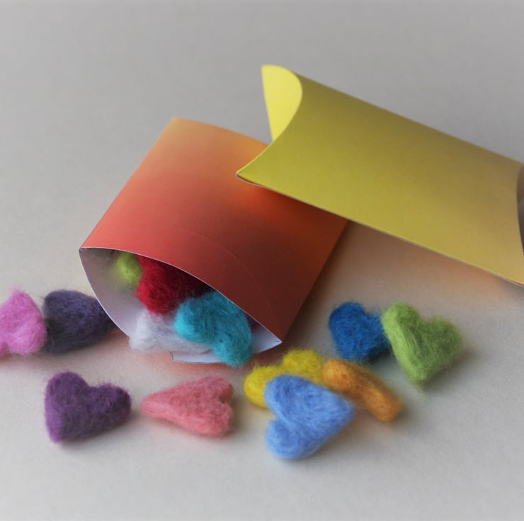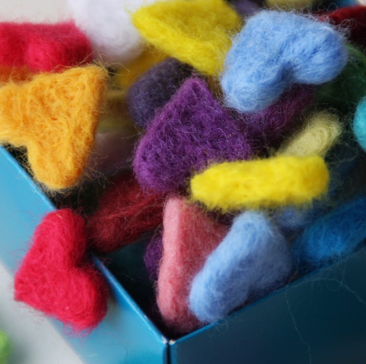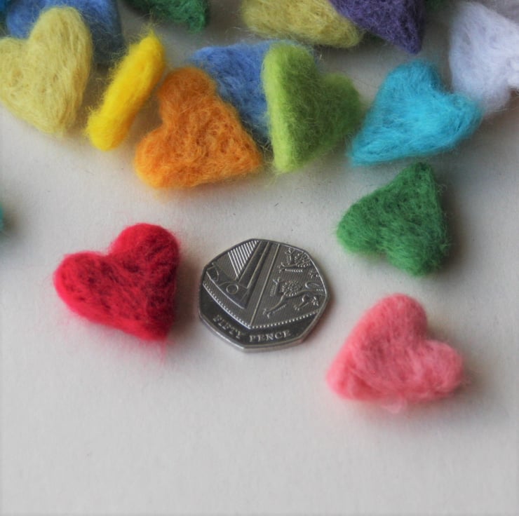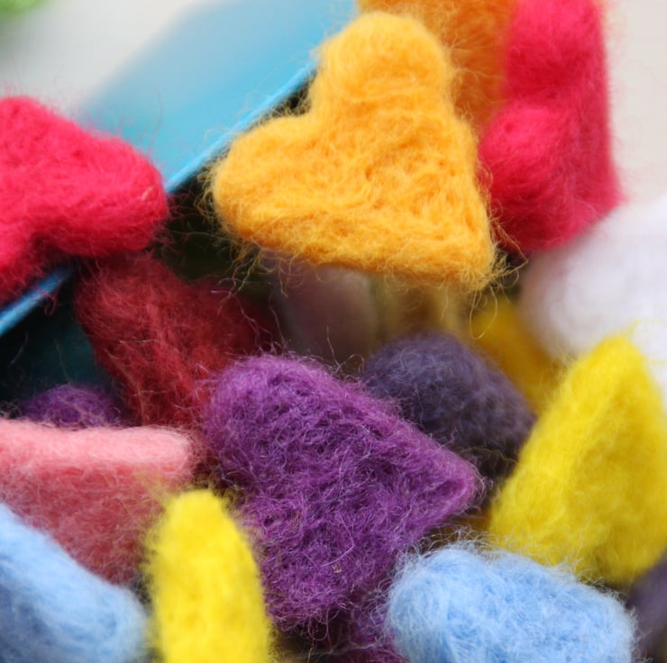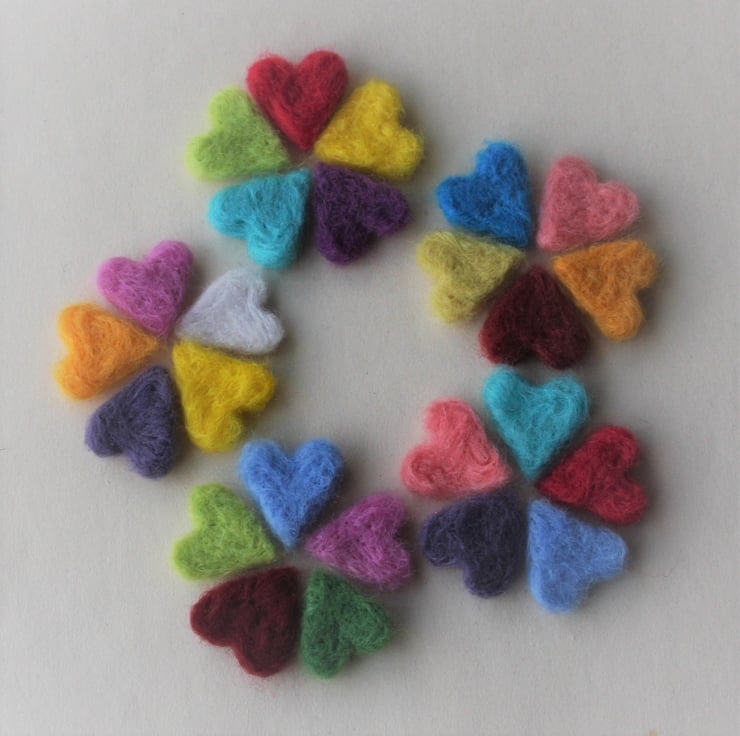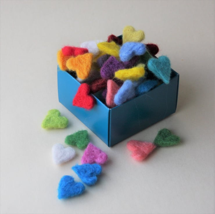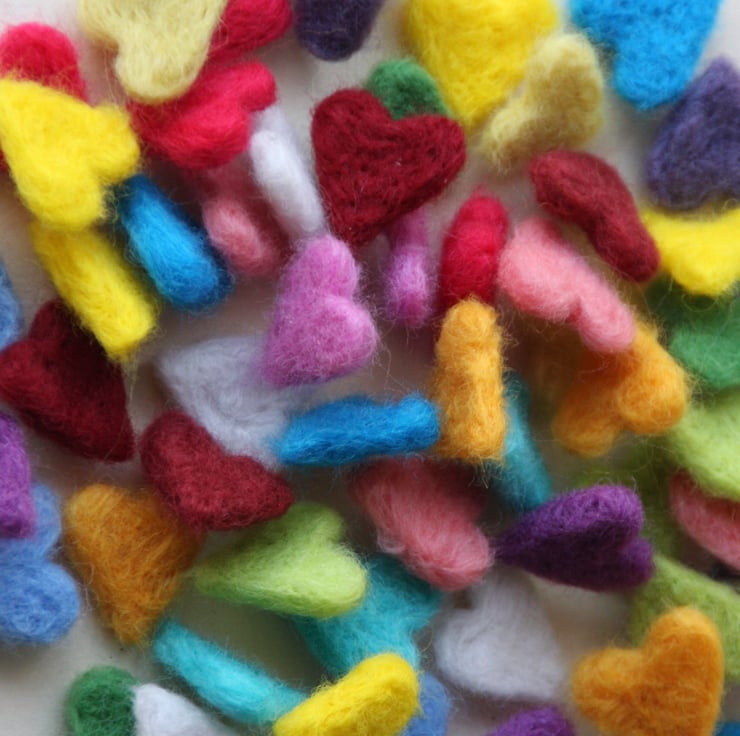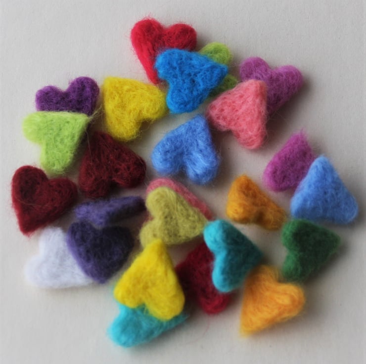 Pack of 25 small, handmade, individually needle felted, fluffy hearts in a variety of colours.