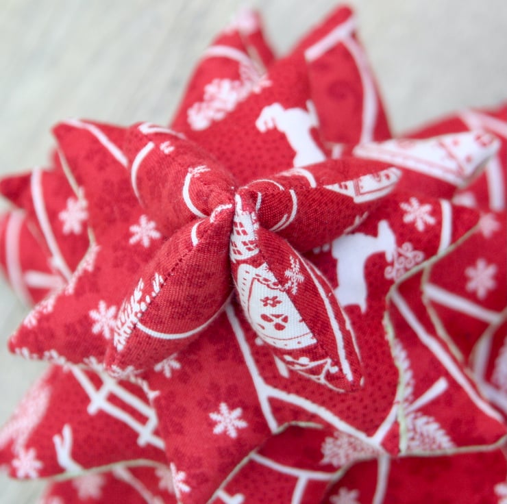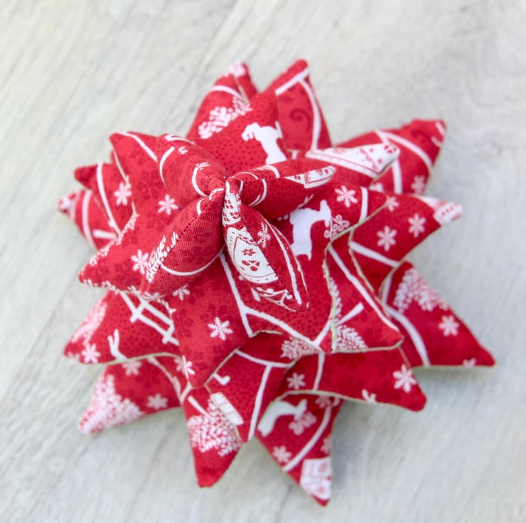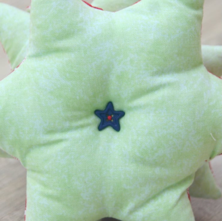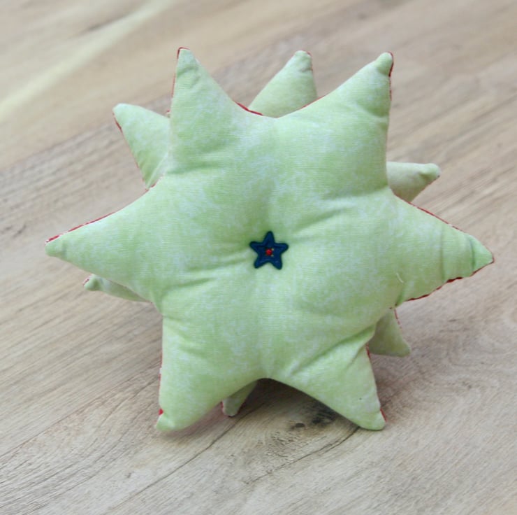 The tree is approximately 15cm tall and approximately 20cm in diameter across at the base. It is made up of 4 sections. Each section has 2 pieces of star shaped high quality cotton machine sewn together and stuffed with polyester stuffing. The top section is triangular pieces sewn together to form the top of the tree. I finish by hand sewing the gap closed and then sewing the pieces together. The tops of each section are made from a red cotton with a christmas scandi design and the underside of each section is a pale green cotton. The bottom is secured with a star shaped button to help hold it all together.