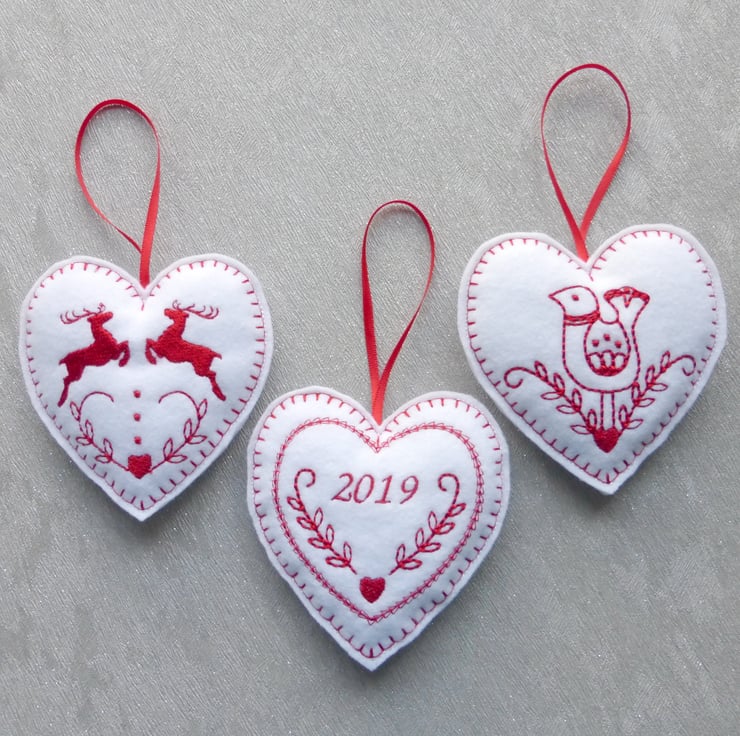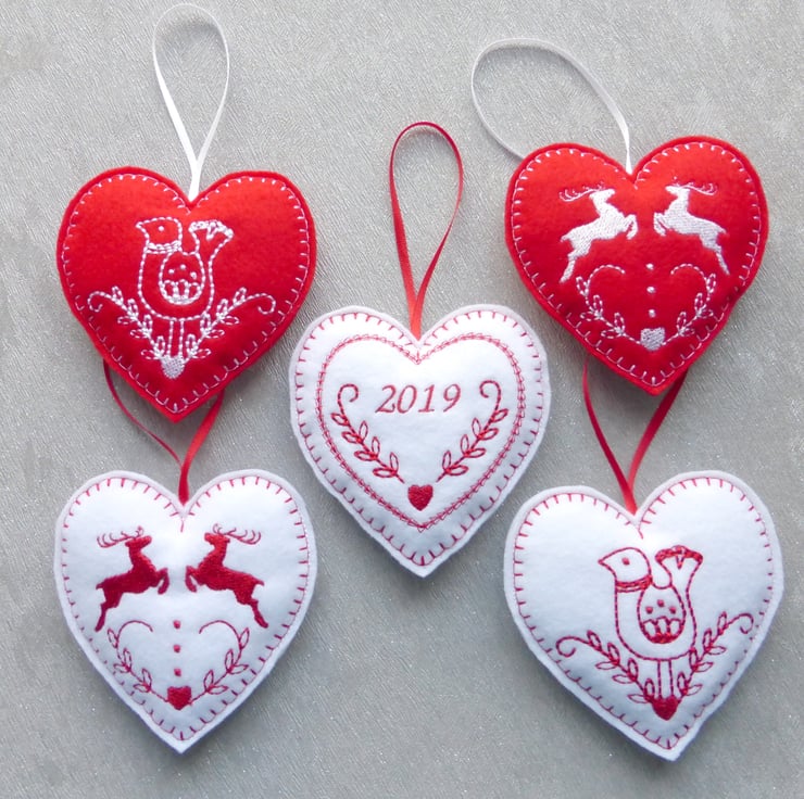 Embroidered on the front with a stag/reindeer design using rayon embroidery threads in red, and stuffed with polyester stuffing.