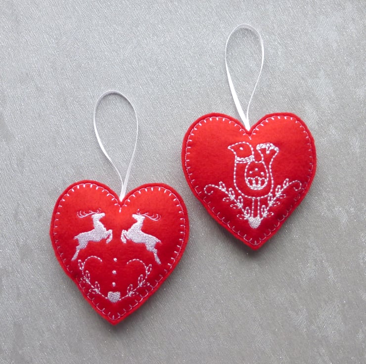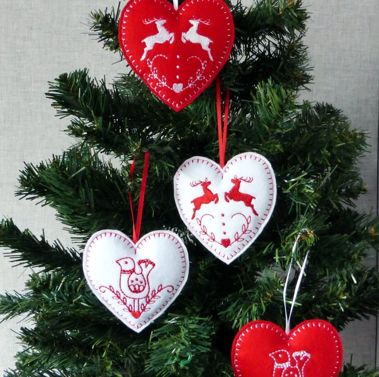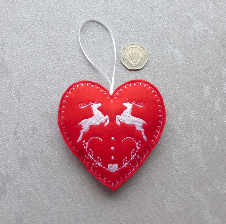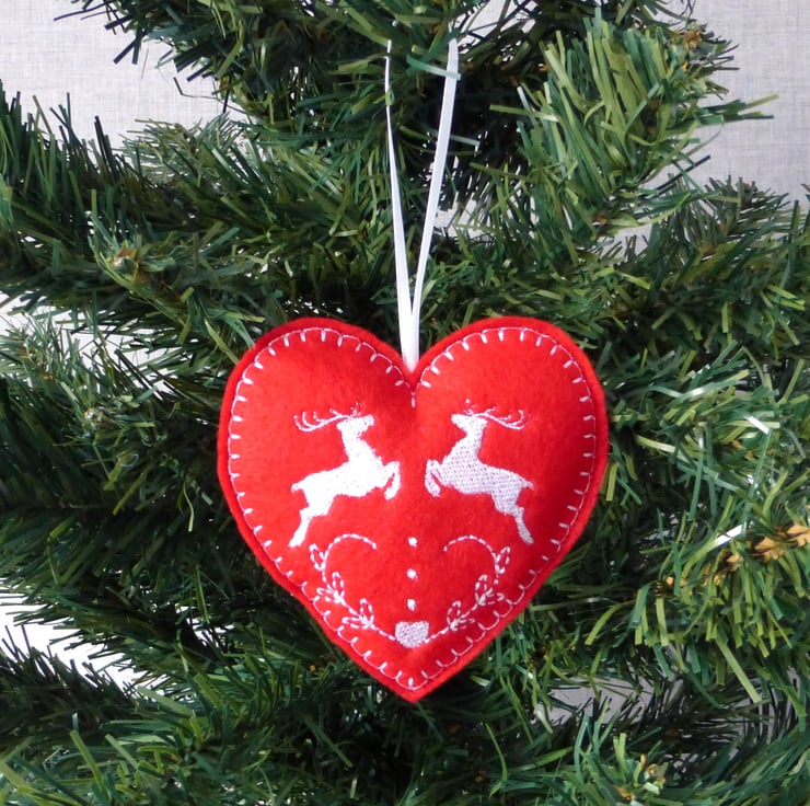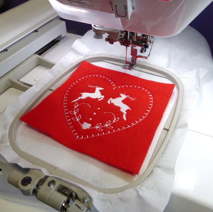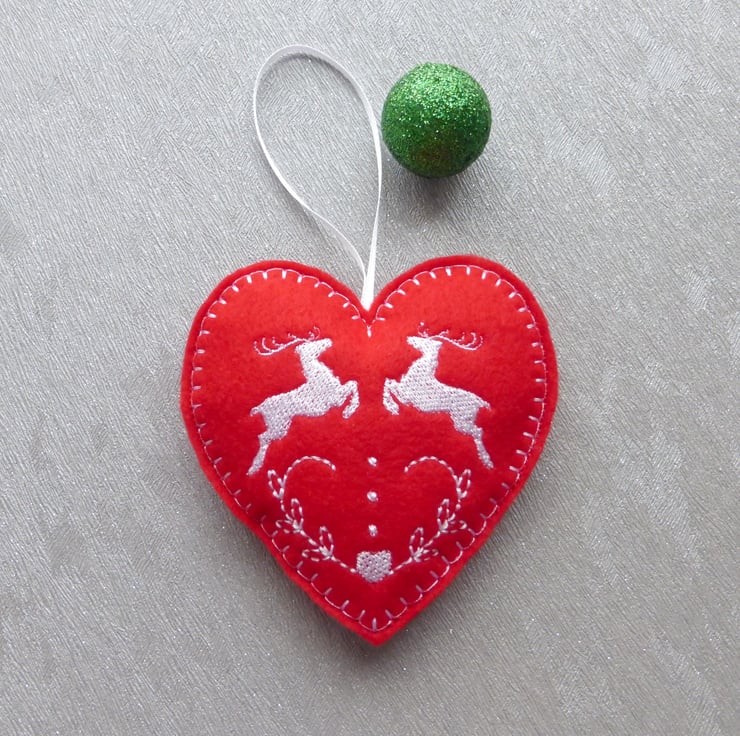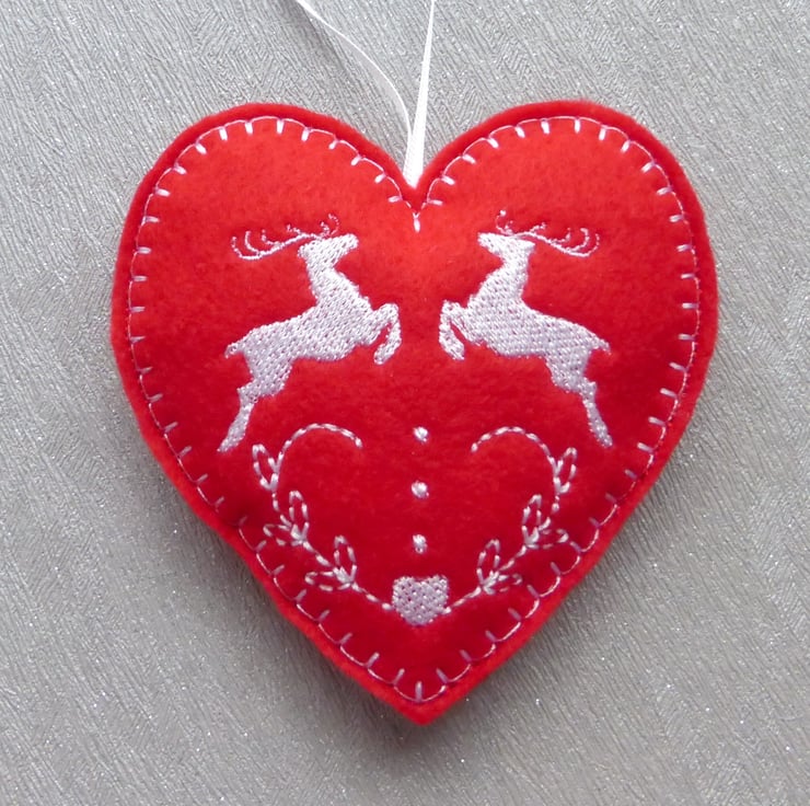 Embroidered on the front with a stag/reindeer design using rayon embroidery threads in white, and stuffed with polyester stuffing.