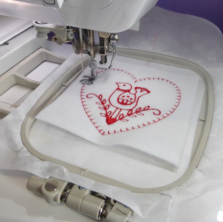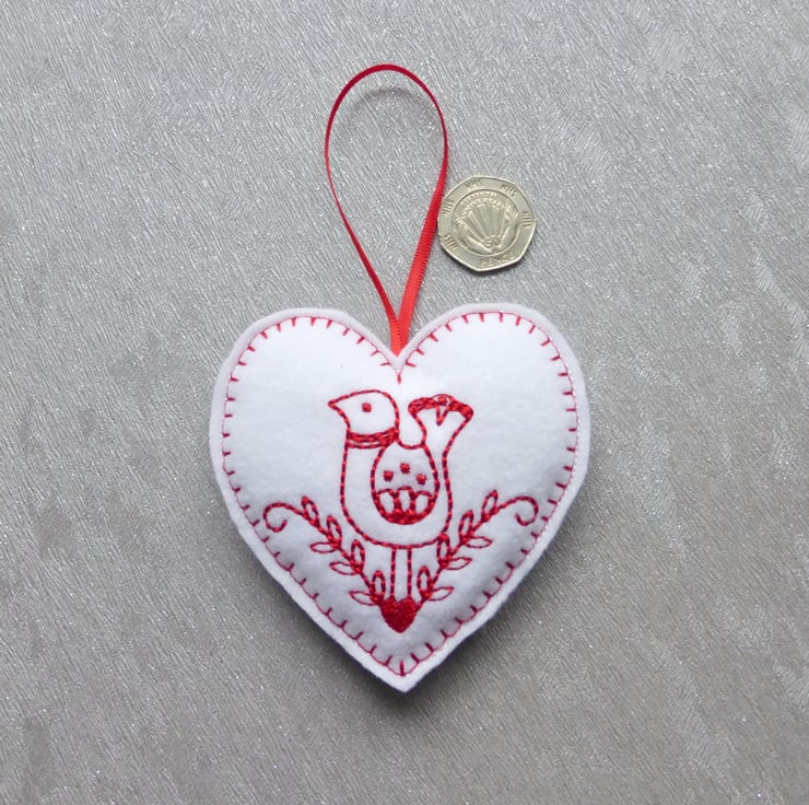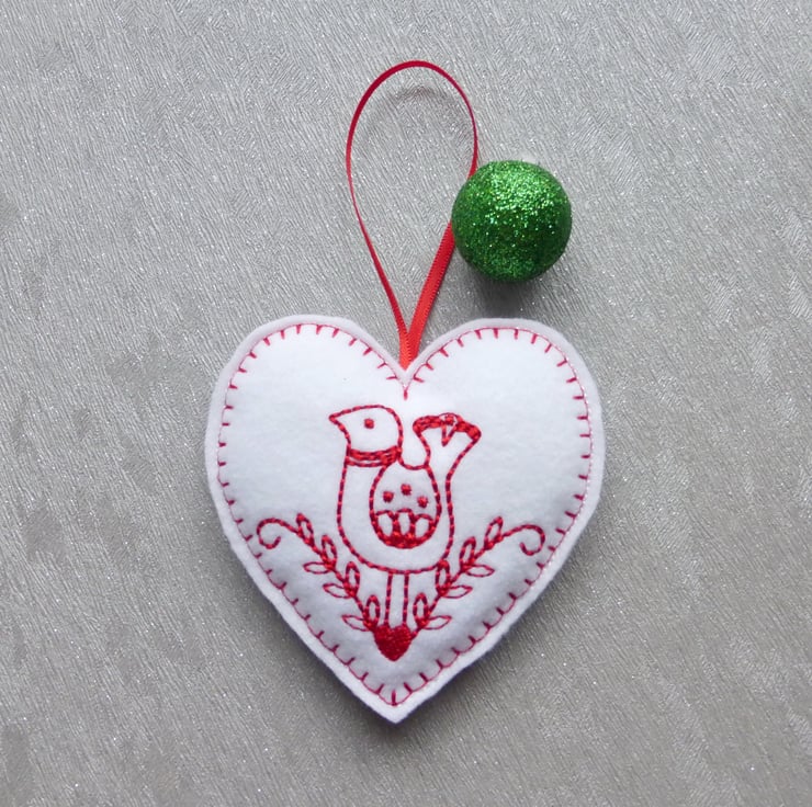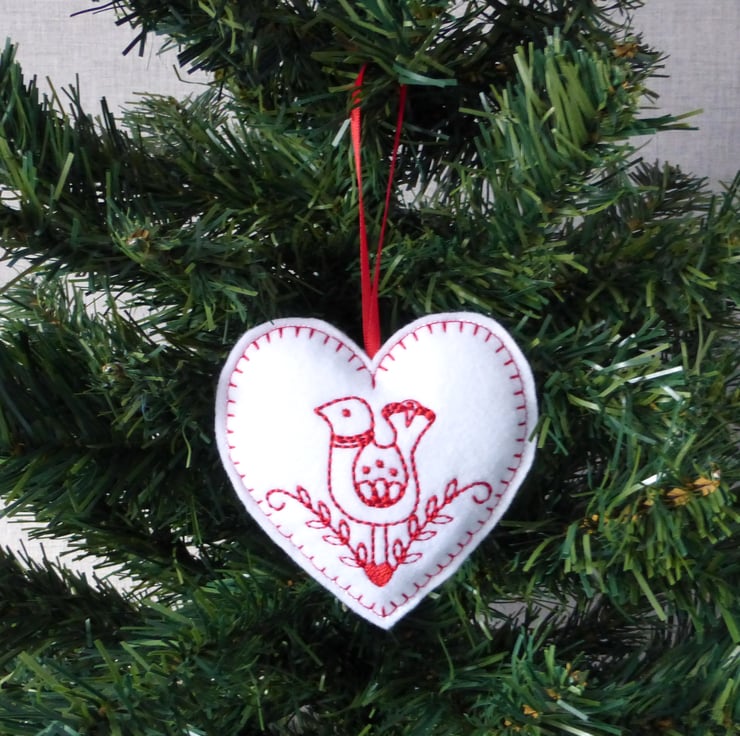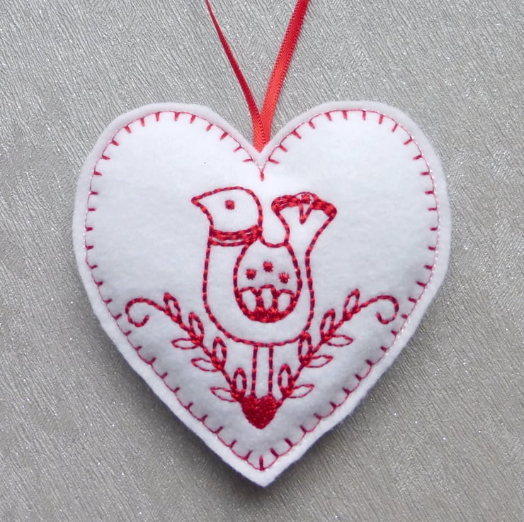 Embroidered on the front with a bird design using rayon embroidery threads in red, and stuffed with polyester stuffing.