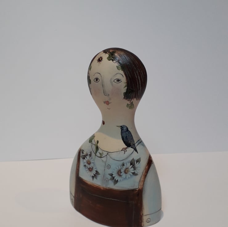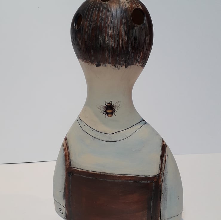 Hand built figurative vase. Measures 26cm in height. Decorated with coloured slips and transparent glaze. With additional ceramic decals of birds, bugs and flowers to add detail. There are openings at the black of the head for flowers or grasses. Will be carefully packed and posted.