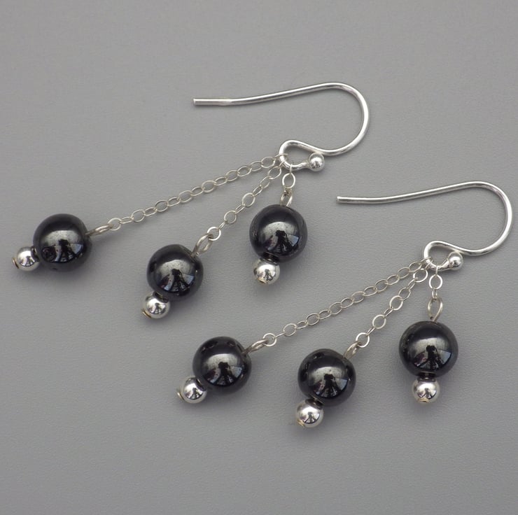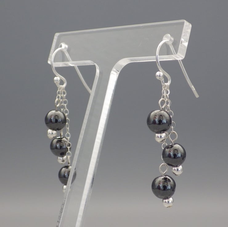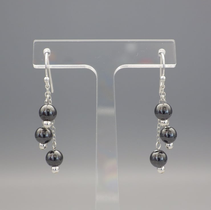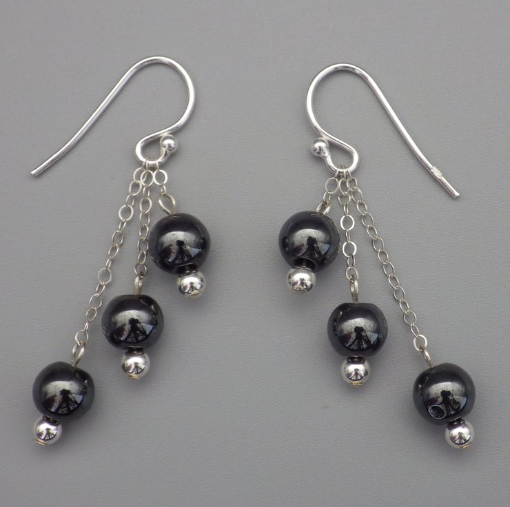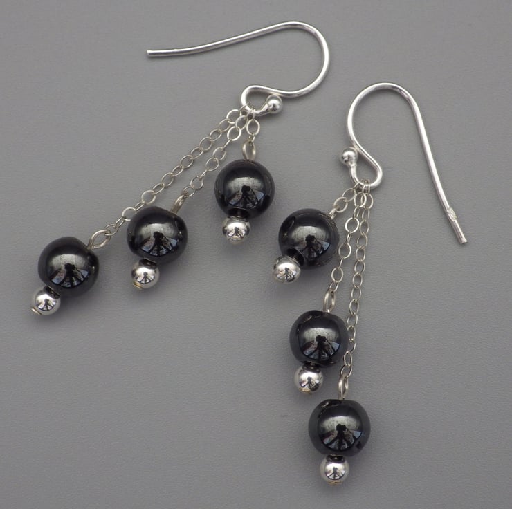 These earrings are made by me using round haematite beads, which are naturally grey and shiny. The beads are hung from Sterling Silver chain and findings to form eye catching classic earrings. A versatile style, they are perfect for an evening out or to cheer up your daytime outfit!