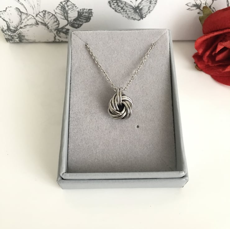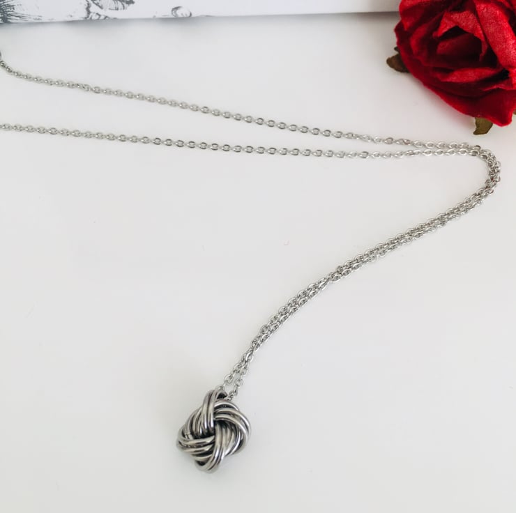 This simple minimalist style necklace is is perfect to wear everyday. The steel love knot has been polished and is ready to wear.