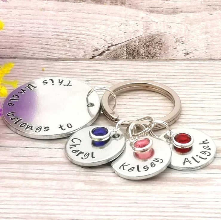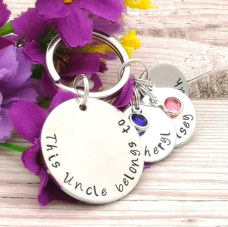 Personalise this colourful keyring with your choice of wording on the larger disc, and personalised name and birthstone crystal charms. The perfect gift for a special Uncle.