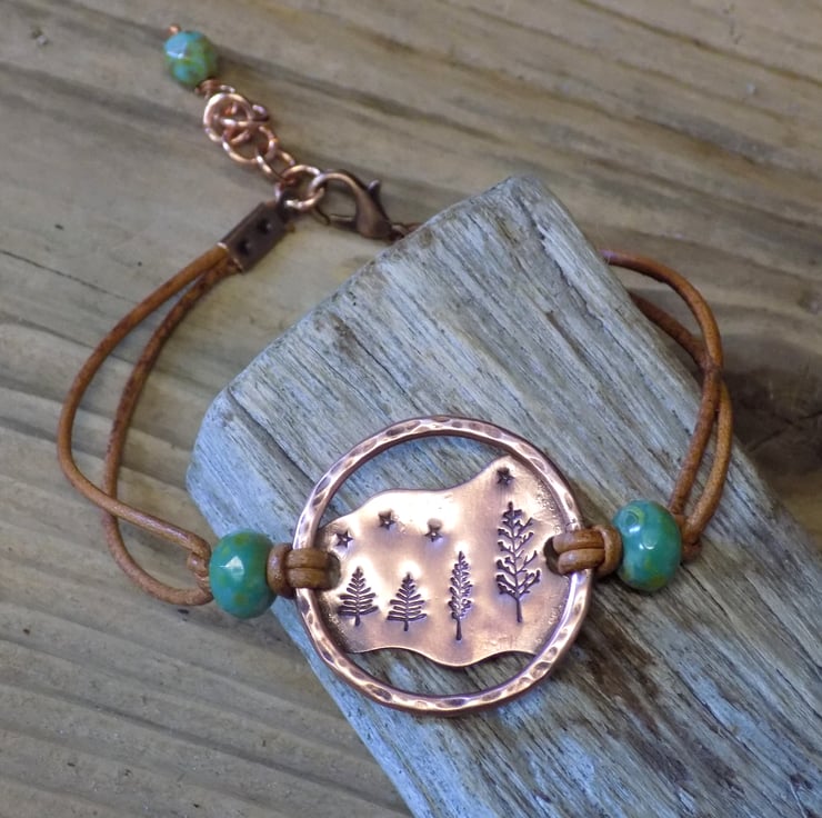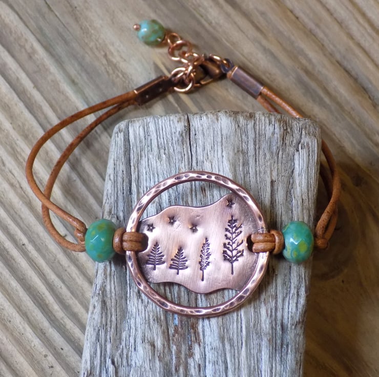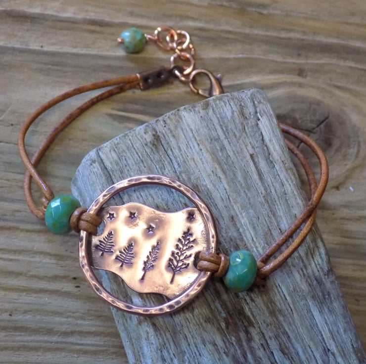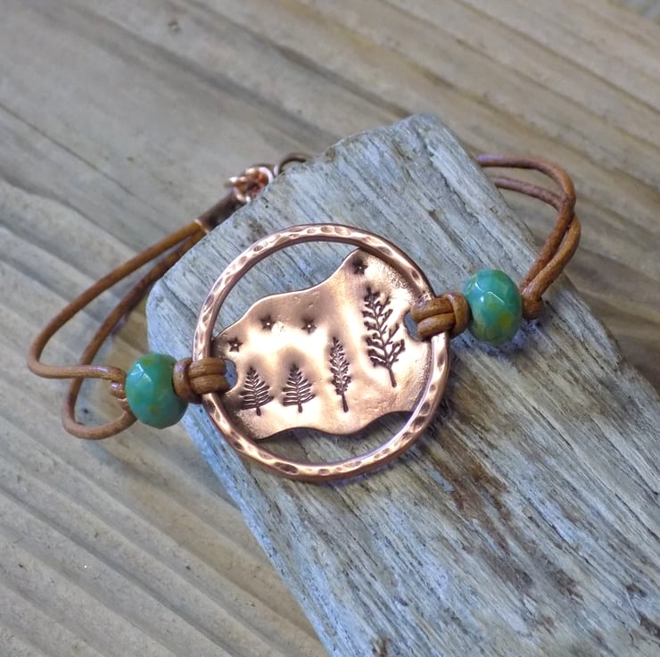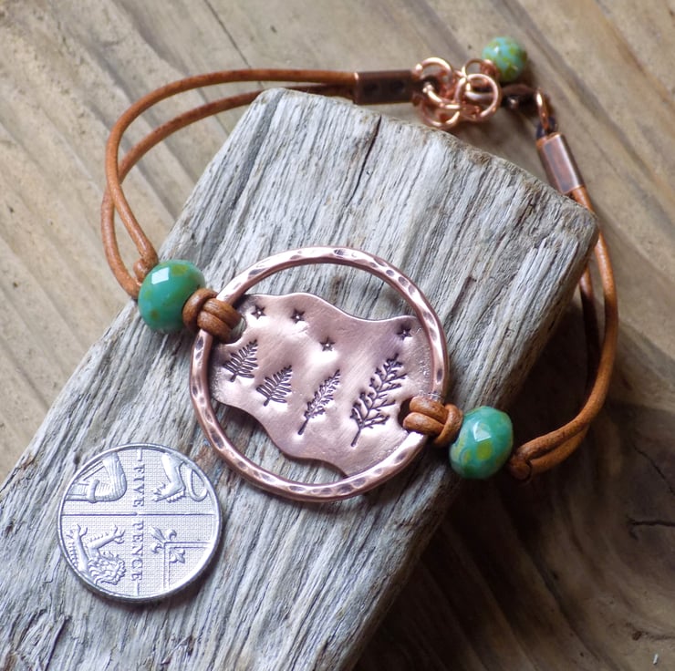 Bracelet featuring a rustic hand made copper wire and sheet focal. The sheet has been stamped with pretty trees and tiny stars, handsawn then soldered onto copper wire which frames the scene. Simply threaded onto doubled up vintage brown leather cord complimented with an aqua czech bead either side which have been drilled out to fit the cord. . Adjustable from approx. 7.5 -8.5 " with lobster clasp closure.