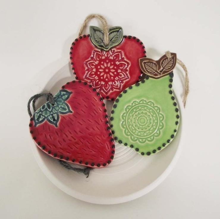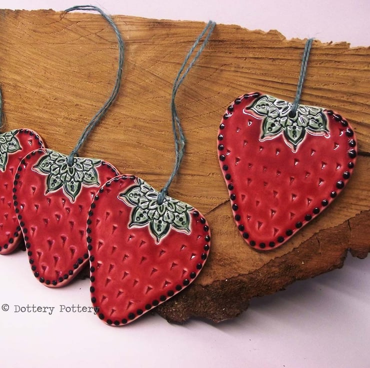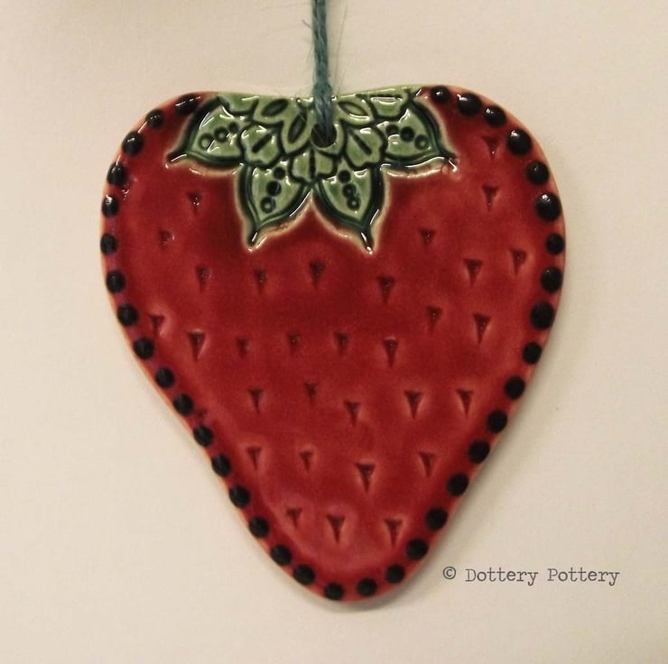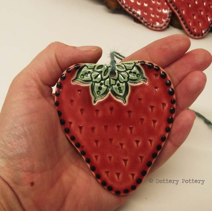 This cute little strawberry is hand cut from white earthenware clay, fired once, a rich glossy glaze is applied and it is then fired again - so is nice and strong.