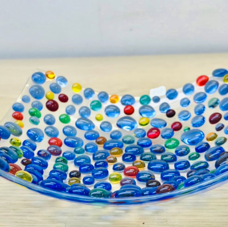 This dish is made over a series of kiln firings . Firstly all the glass beads are cut by hand and fused at a high temperature . The glass beads are then added to a glass cut base to retain texture . The glass is then slumped to achieve its shape