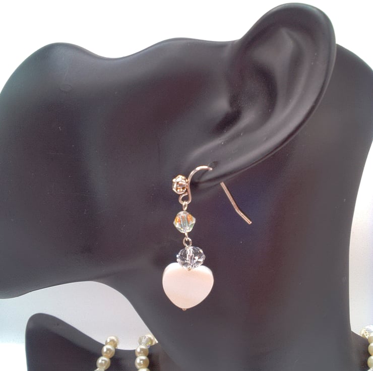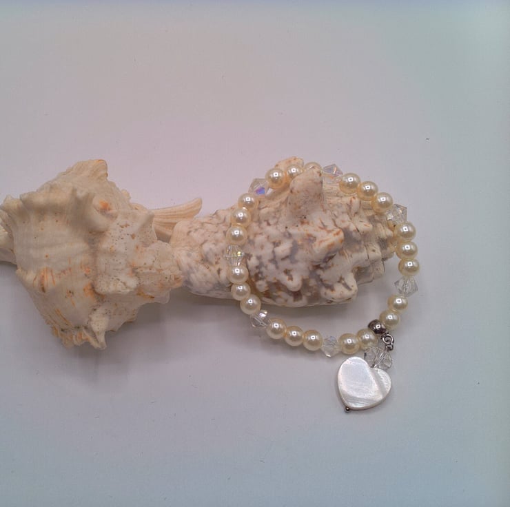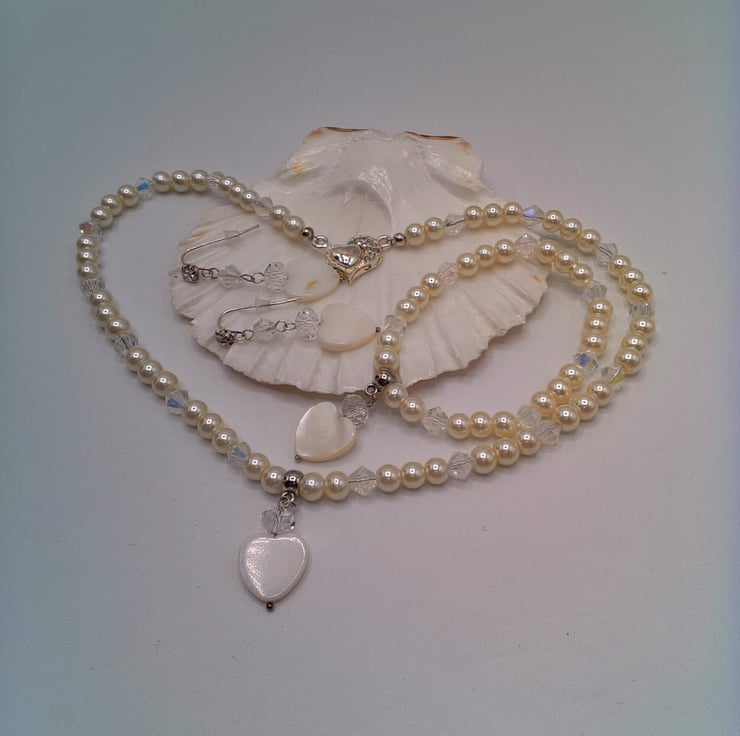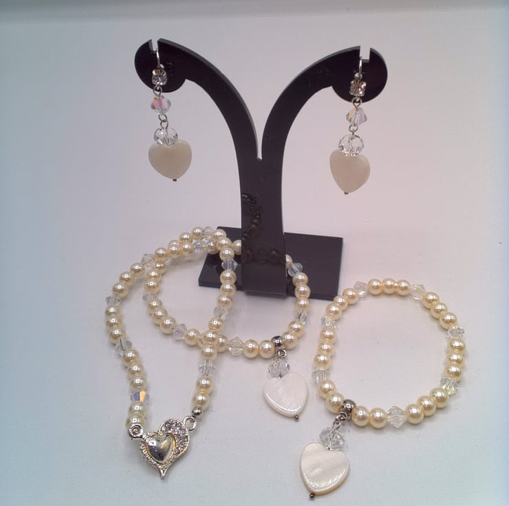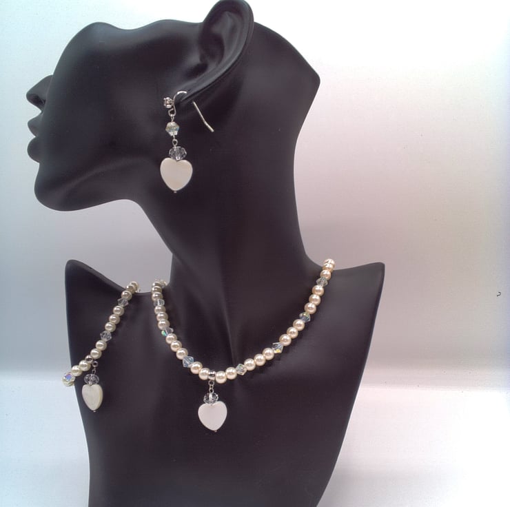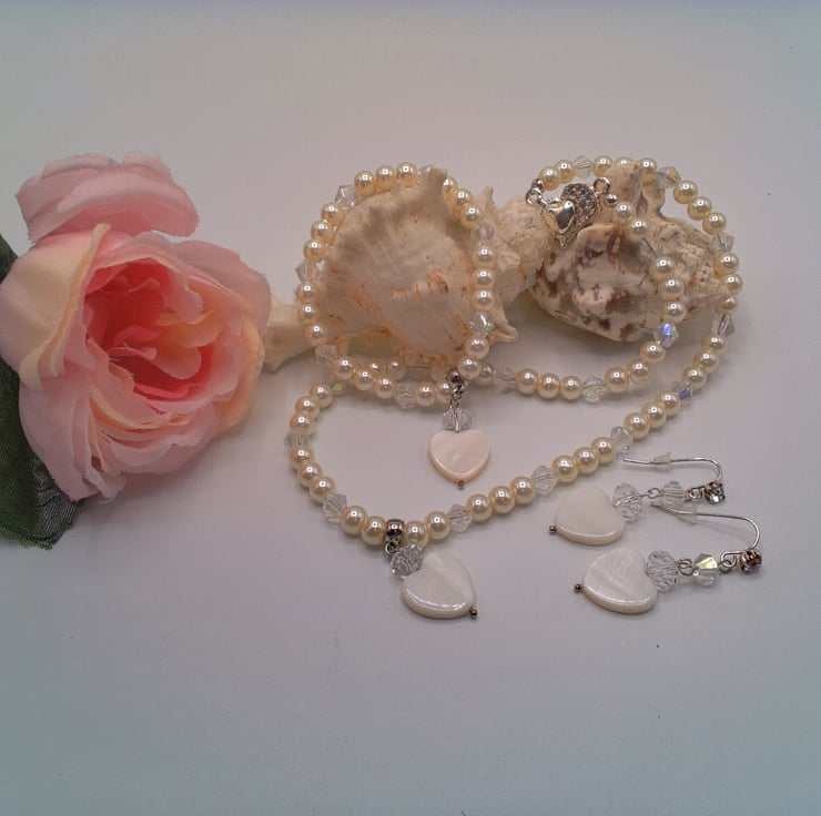 This beautiful pearl jewellery set comprises a necklace, bracelet and pair of earrings. It would go well with any outfit that you choose for a special occasion. The necklace is made using 8 mm cream glass pearls and 6 mm clear crystal rondelle beads, with a cream Mother of Pearl heart and crystal rondelle bead pendant. It is fastened with a stunning rhinestone encrusted magnetic heart silver plated clasp. The Bracelet is made with the pearls and crystal bicones threaded onto jewellers elastic The earrings have sparkly crystal silver plated ear wires. The necklace is 42.5 cm in length with a drop of 1 inch (25 mm) for the heart pendant. The bracelet is 6.25 inches (16 cm), unstretched, and will comfortably fit a wrist that is 6.5 - 7 inches (16.5 cm - 17) cm in diameter, the heart pendant has a drop of 1 inch (25 mm) from the silver plated bail and the earrings have a drop of 1.75 inches (45 mm) from the base of the crystal ear wire. The jewellery set will be dispatched wrapped in tissue paper in an organza bag and delivered via Royal Mail first class post.