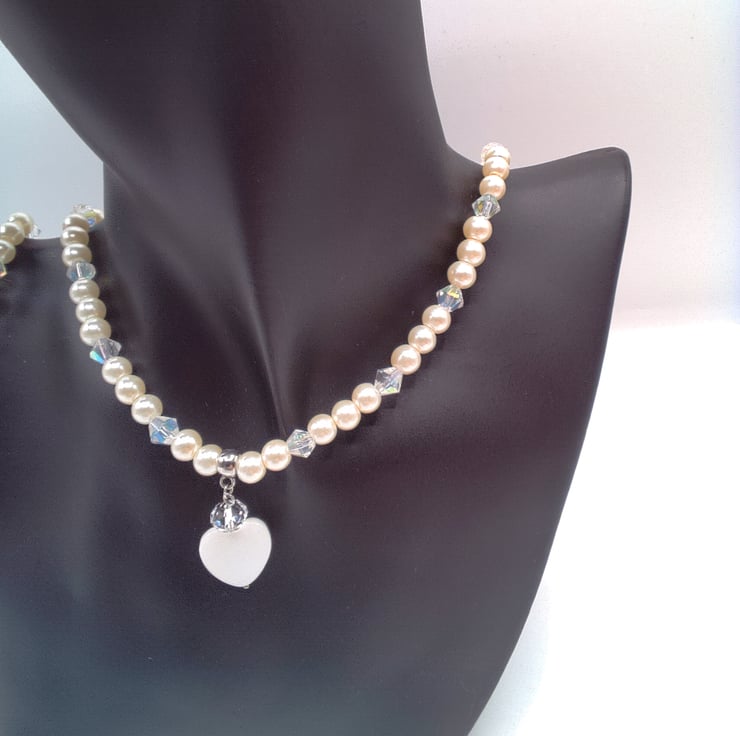 Cream Pearl Necklace Bracelet and Earrings With Shell Heart Beads, Pearl Jewellery Set, Pearl Necklace, Pearl Bracelet, Pearl Earrings, Birthday Gift, Anniversary Gift, Mother's Day Gift, Gift for Her