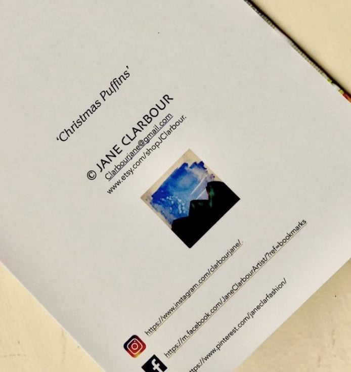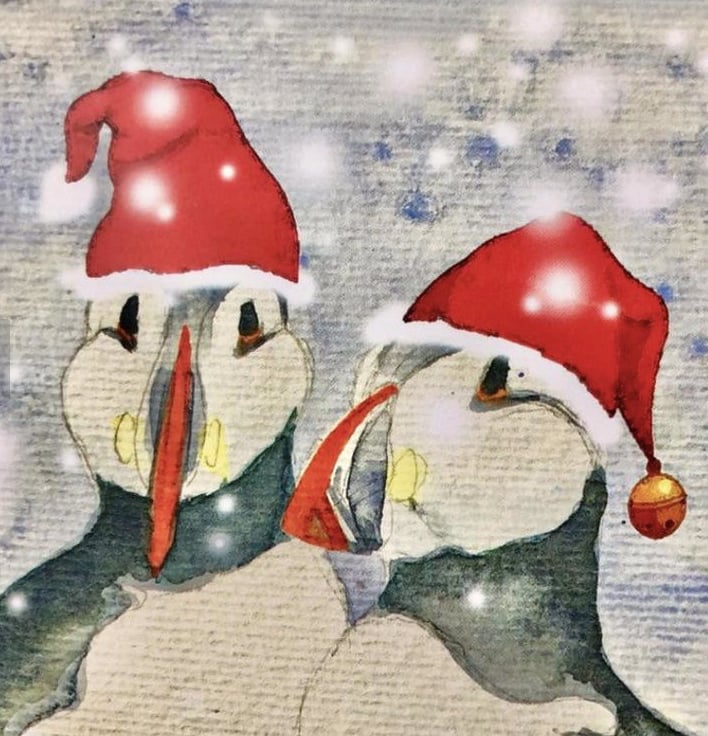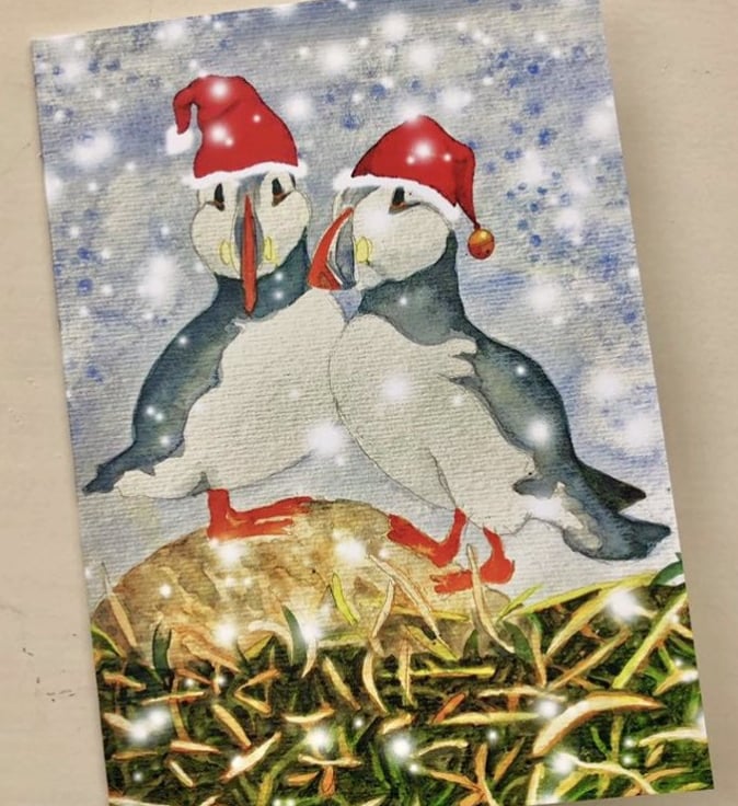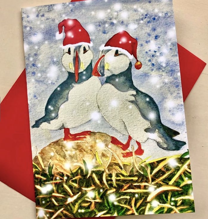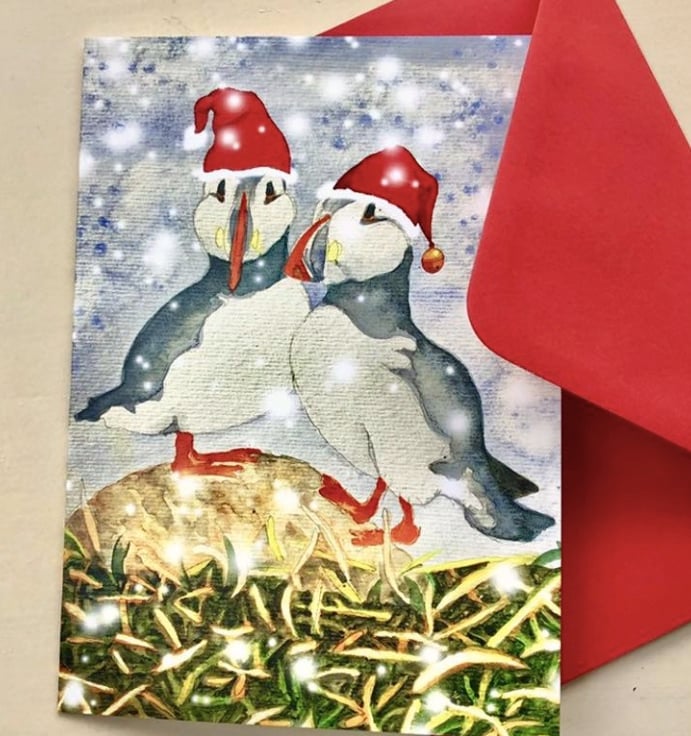 This artist greeting card is specially for Christmas but is also blank inside for your your own personal message, making it ideal for any other occasion too! The design is a watercolour rendition of the famous puffins who live in the cliffs of the tiny hillside town of Bempton on the North Yorkshire Coast of the UK. In this design they are wearing Santa hats to keep warm in the cold winter months! It is a print of my original watercolour painting. You can share this original painting with your friends and family in the form of this cute and quirky Christmas card!