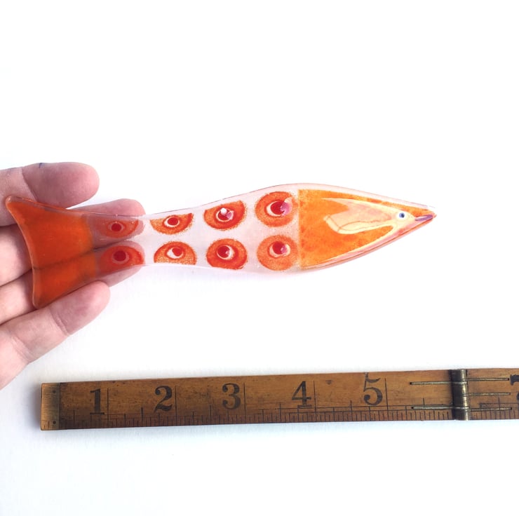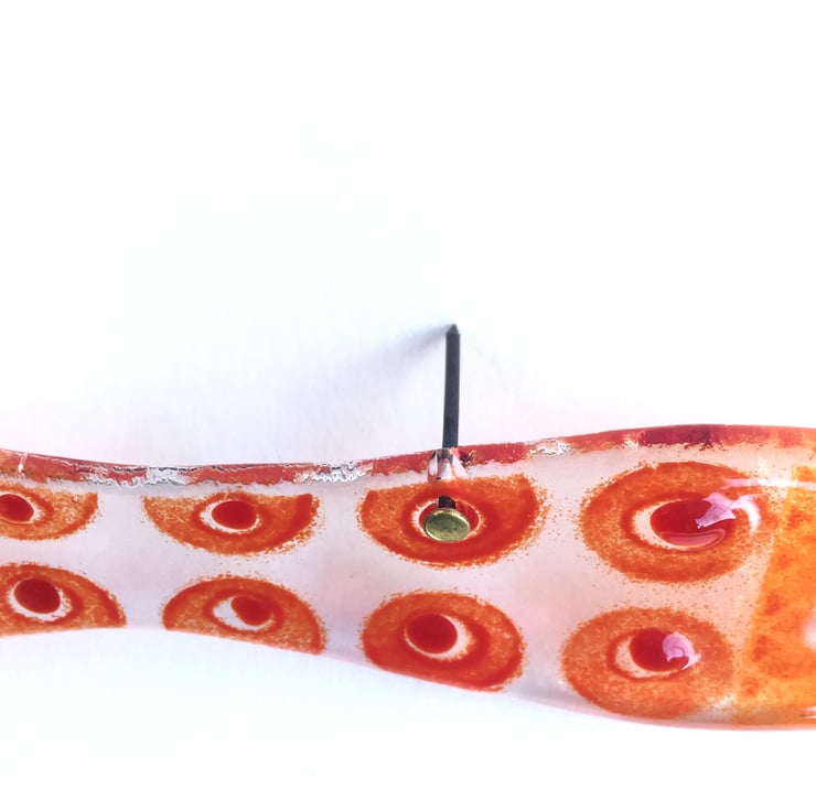 Kiln forming is a process where glass sheets are cut into the required shape, layered and then heated in a kiln to a temperature where the glass melts and the layers fuse together. I use glass sheet and glass powder to make my fish. They have been digitally annealed and cooled for strength and safety in my garden studio in Bristol.