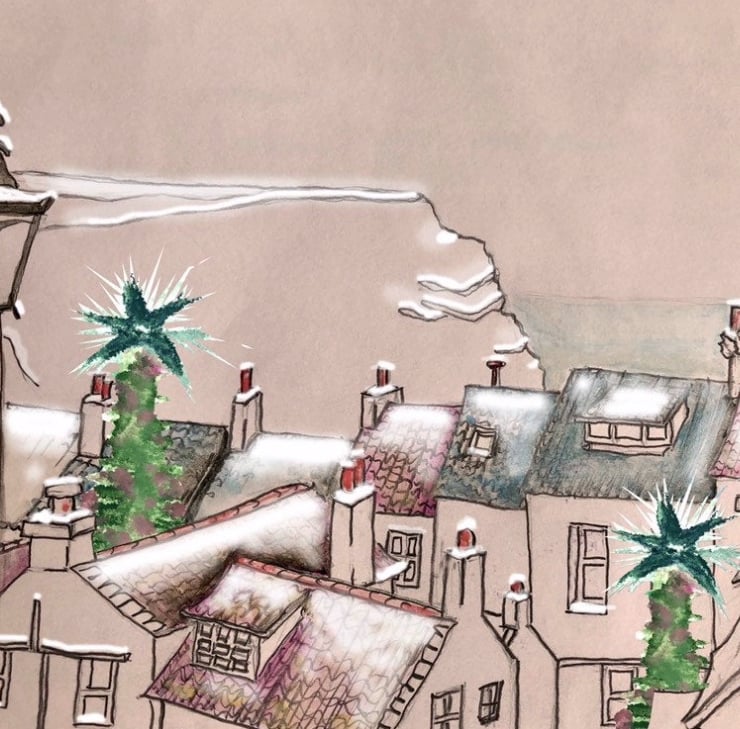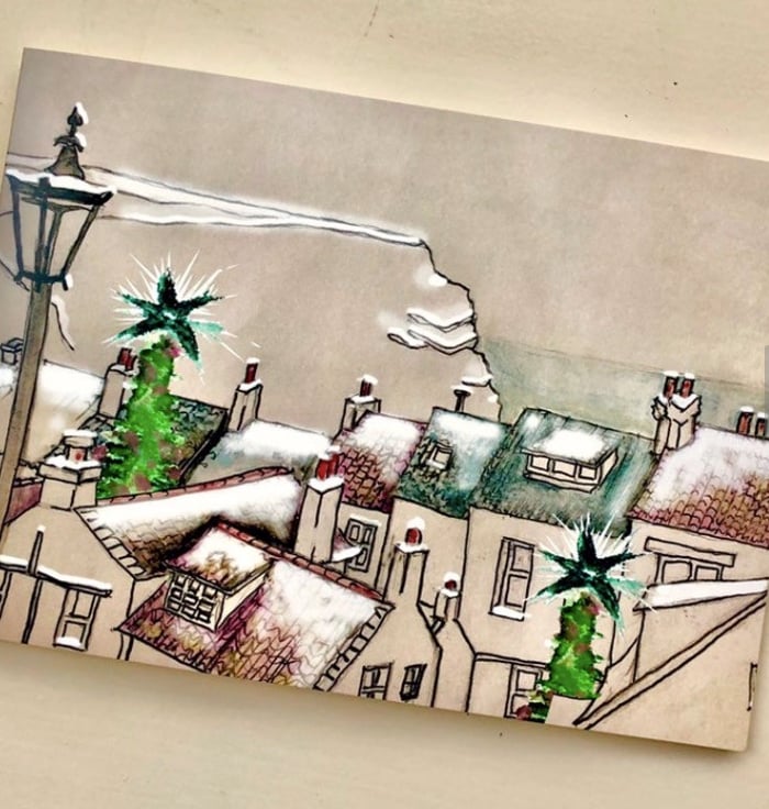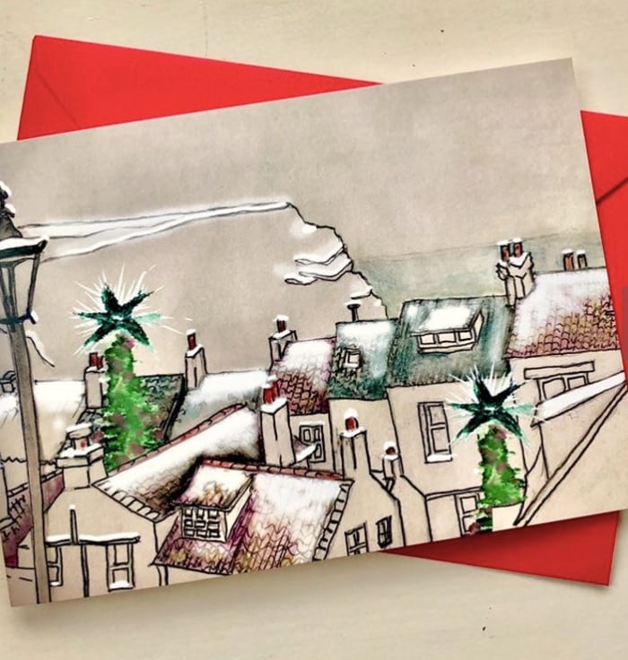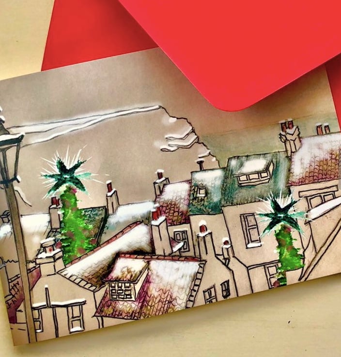 My inspiration was snowy days and Christmas trees across the rooftops of Staithes, one of the most picturesque villages on the North Yorkshire coast!