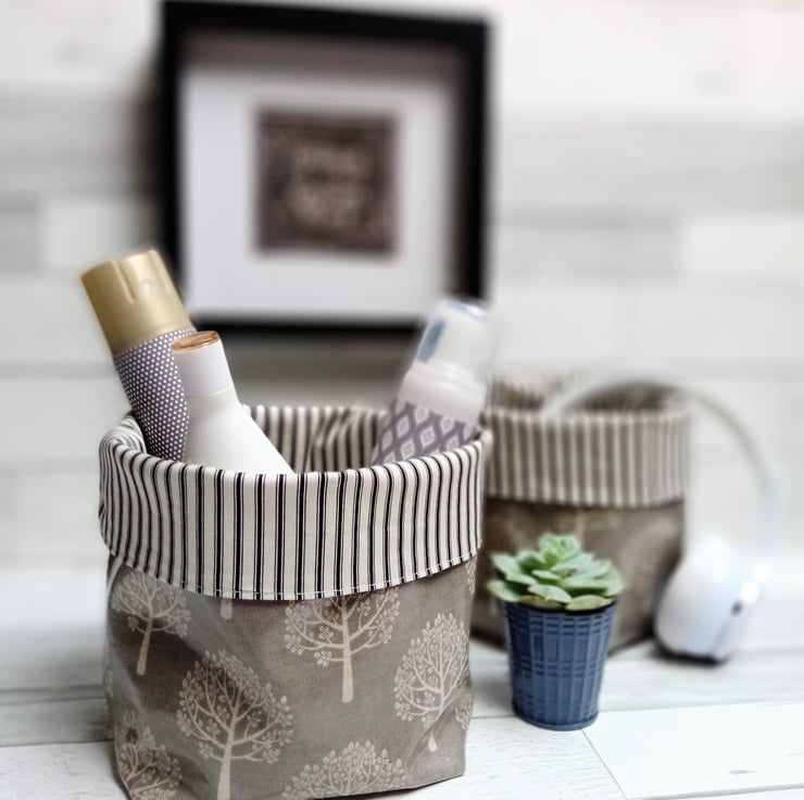 These stylish storage baskets are carefully hand-made using gloss PVC coated cotton (oilcloth) and lined with a complementary black and cream cotton lining.