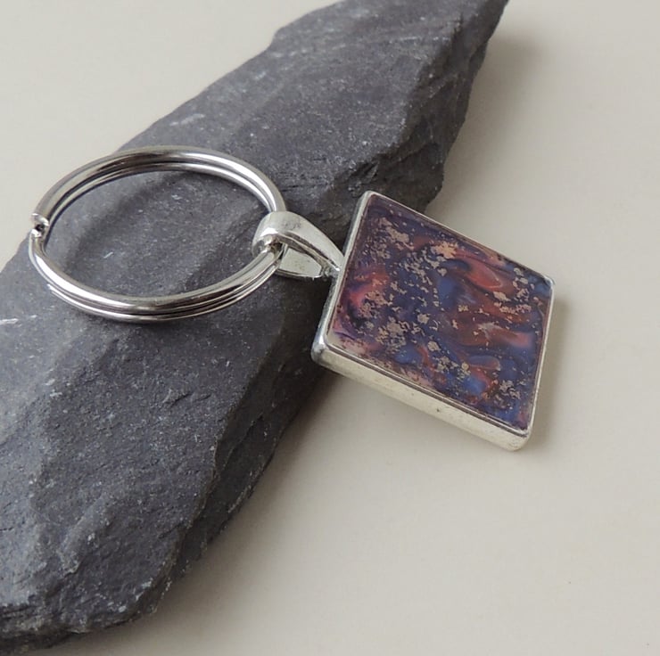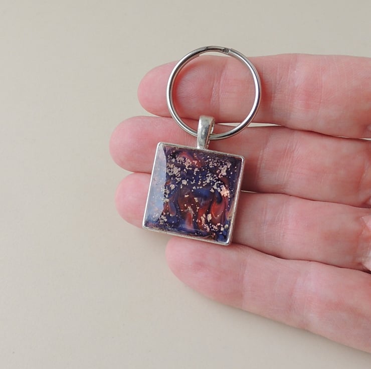 I made it with paints and resin and a sprinkle of gold dust in a square shape silver plated bezel and then sealed it with a coat of clear resin.