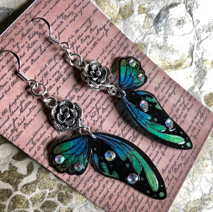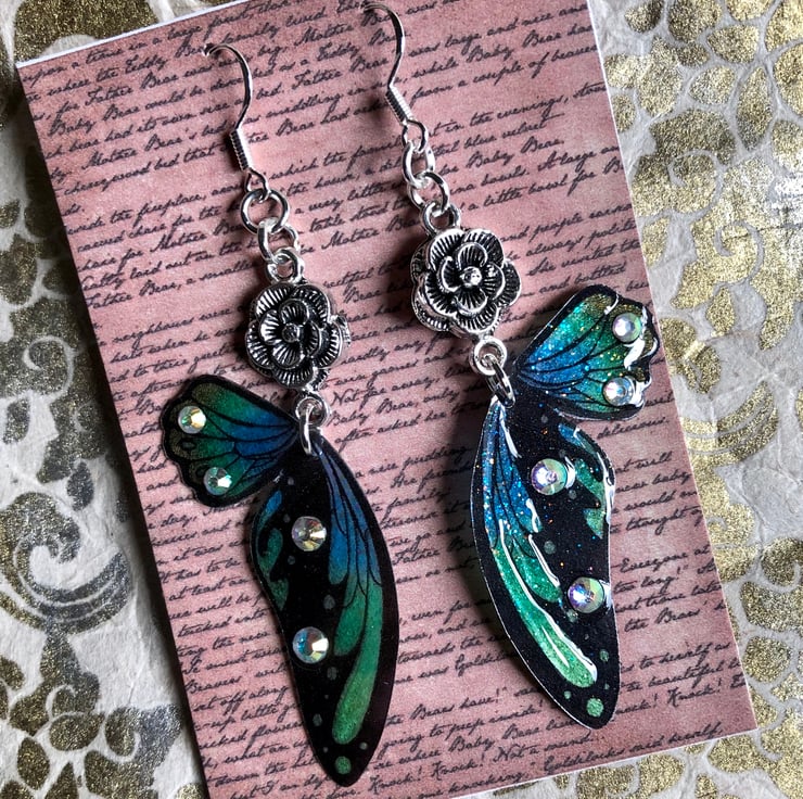 The sparkling fairy wings hang daintily beneath silver coloured rose connectors.