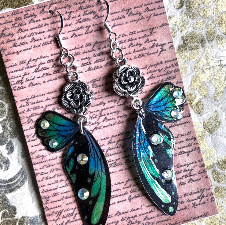 I have added lots of tiny iridescent pieces of glitter beneath the surface of each wing which gives a beautiful sparkle when the light hits them. I have added some pretty Aurora Borealis rhinestones to each wing and then glazed them to add surface texture and shine.
