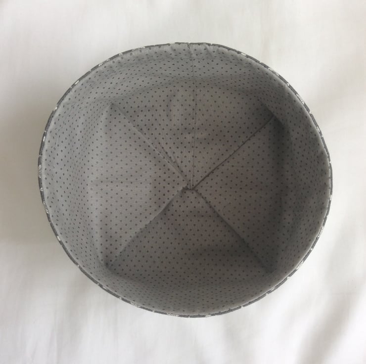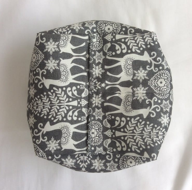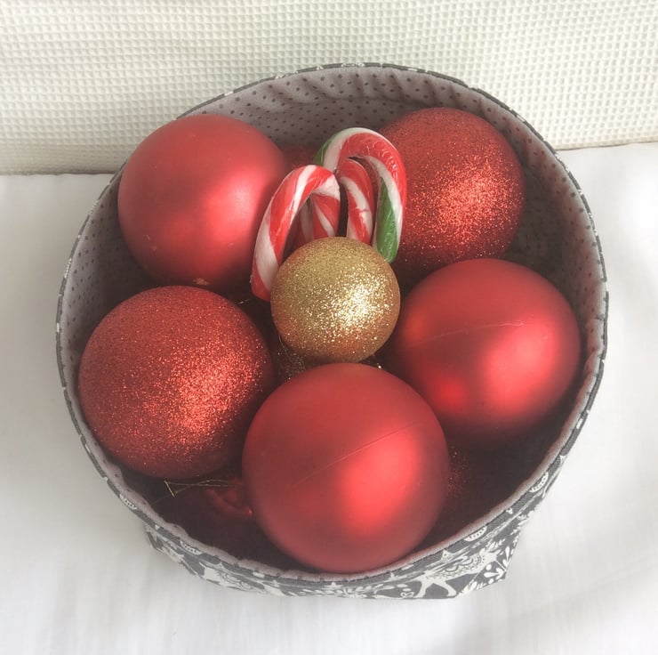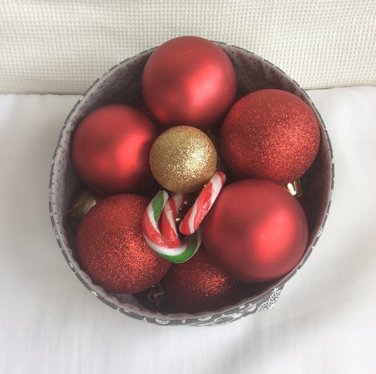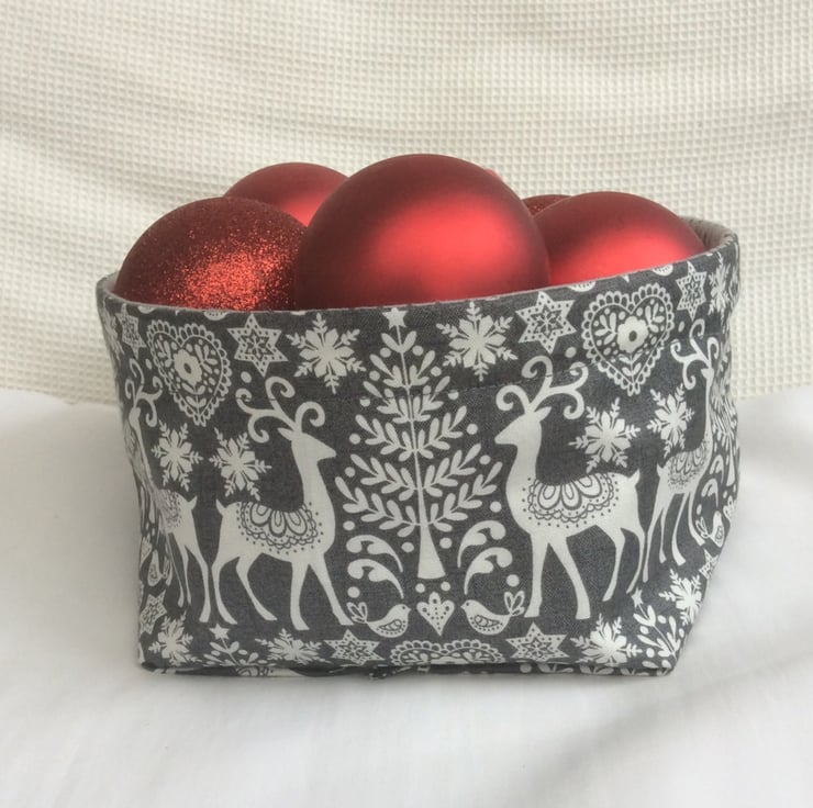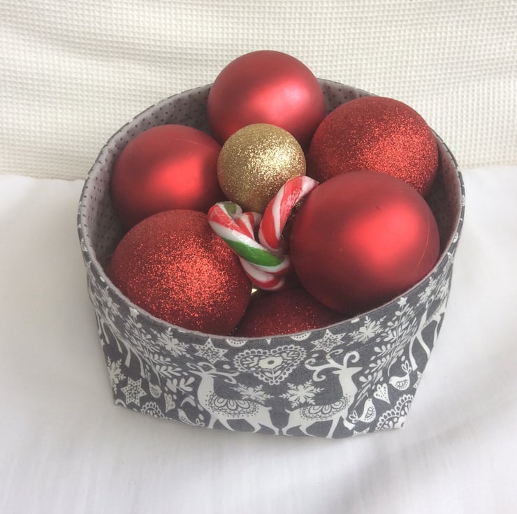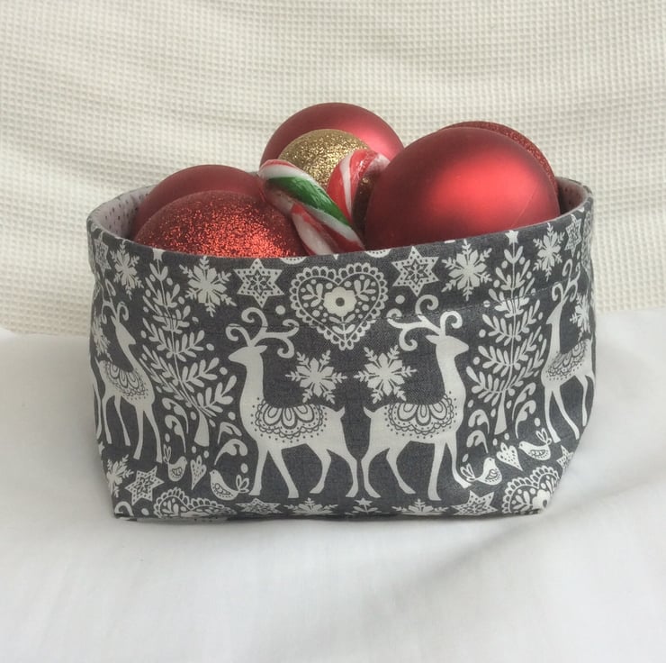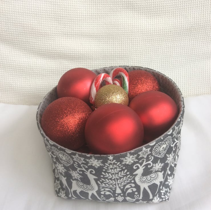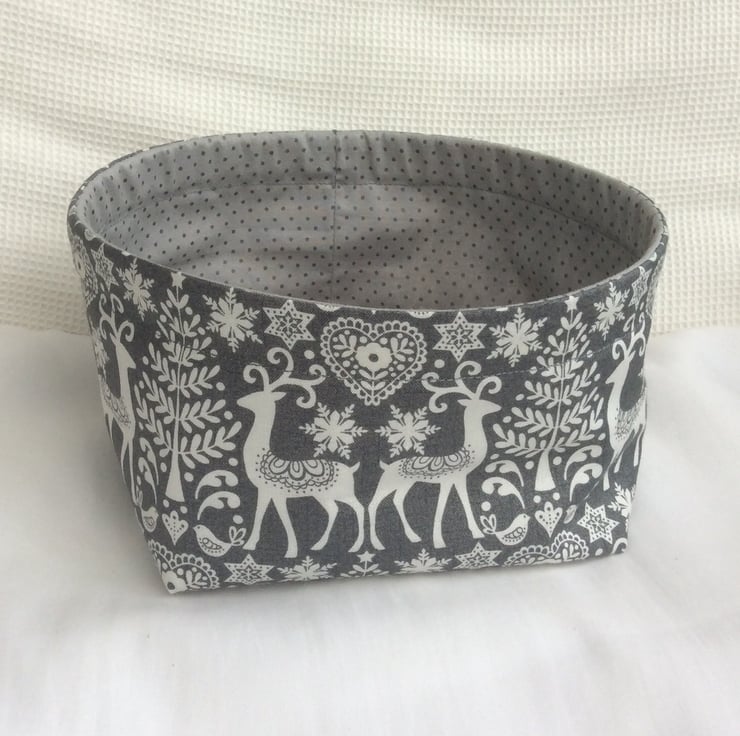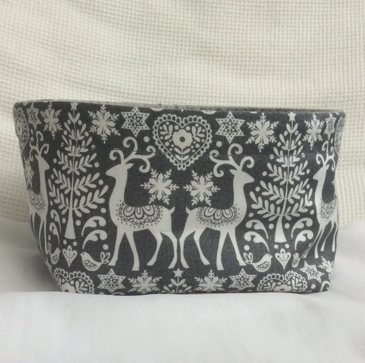This Christmassy, wintery bowl/basket is made using a grey cotton fabric with white Christmas motifs and a matching grey cotton lining with small dark grey dots.