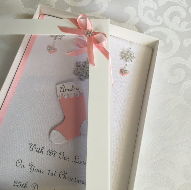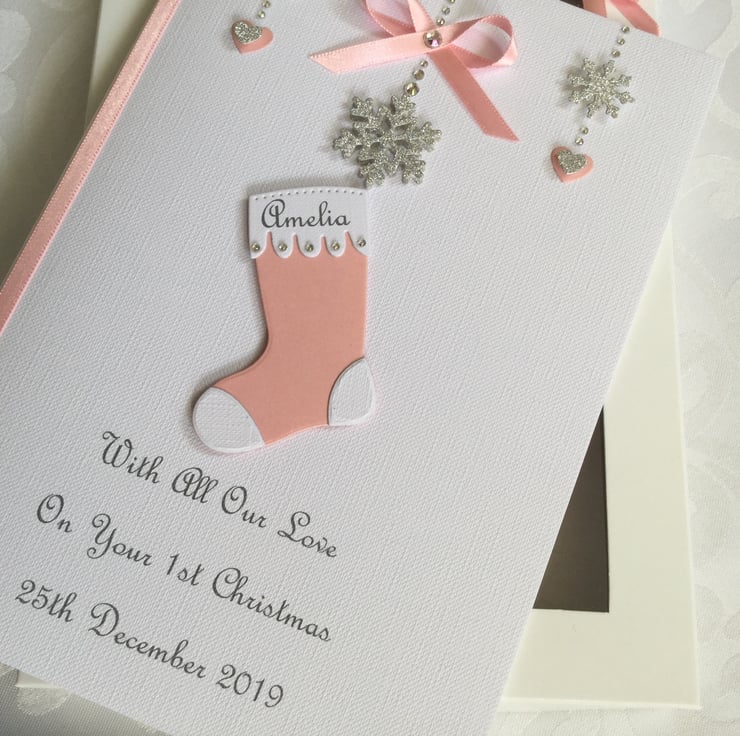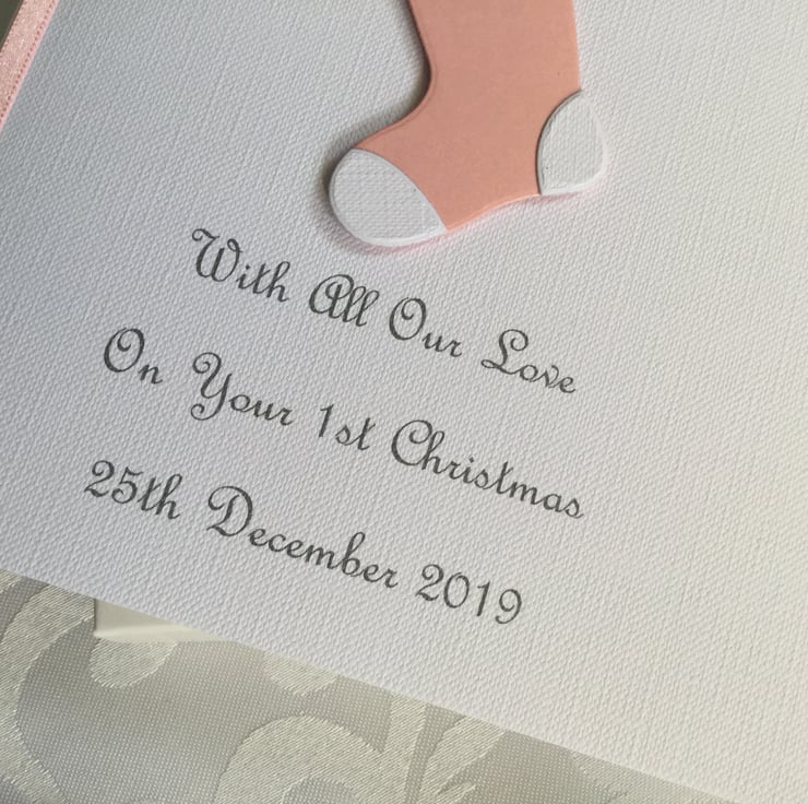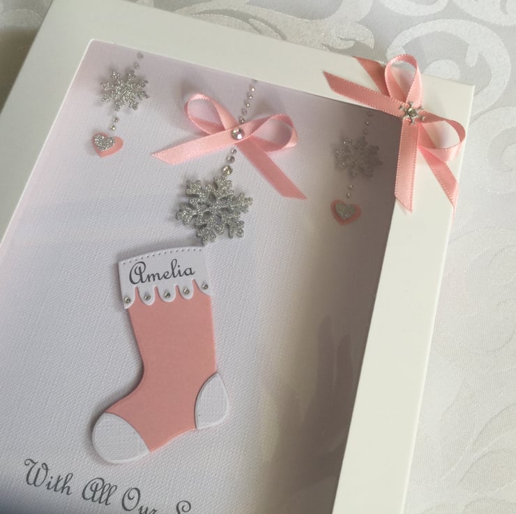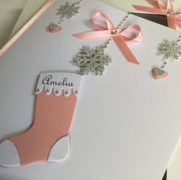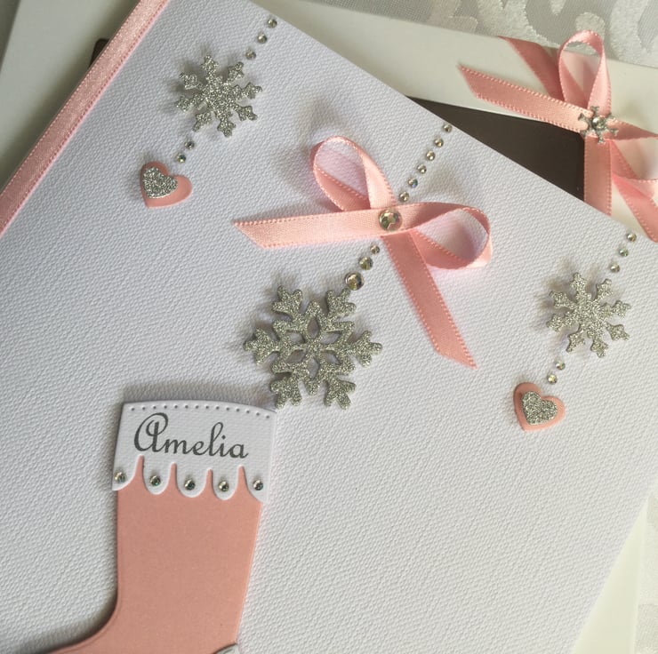 This handmade personalised Christmas card is A5 in size ( 210mm x 150mm) and is on 300gsm heavyweight linen card. This card is personalised with the name of the child on the Christmas stocking along with the text of your choice underneath.