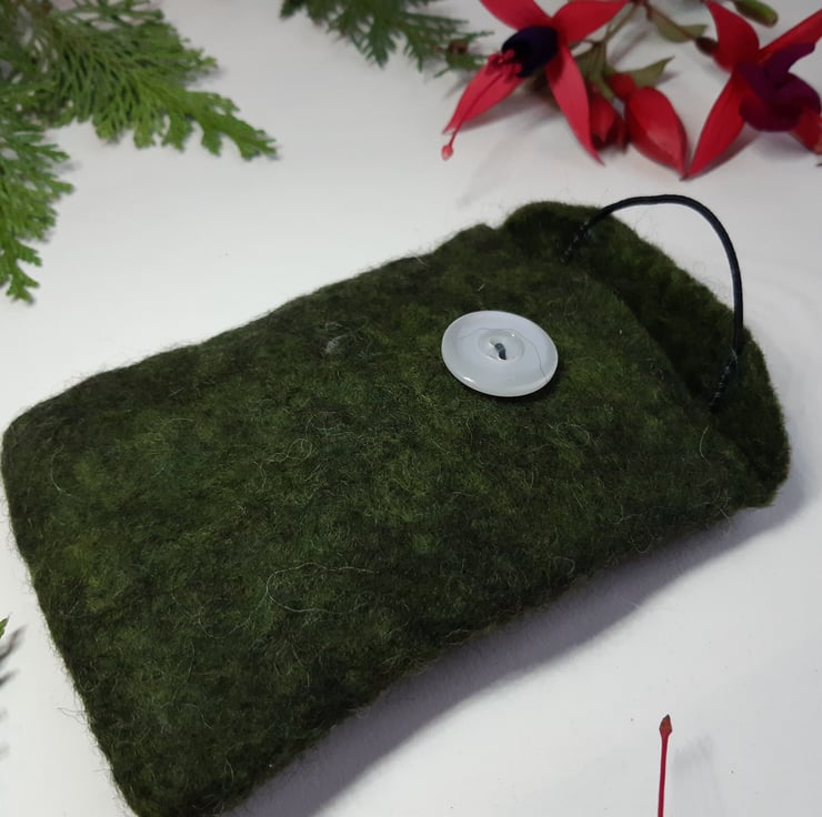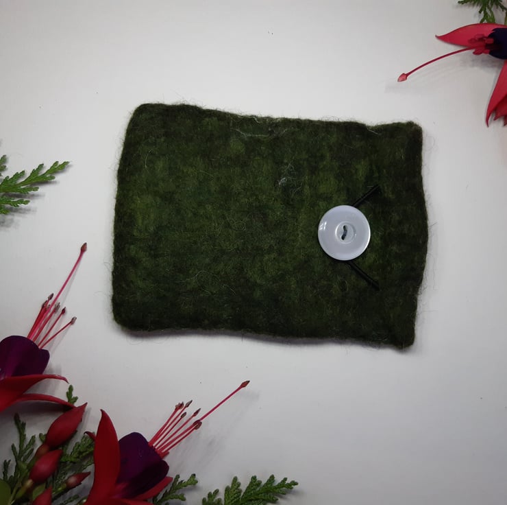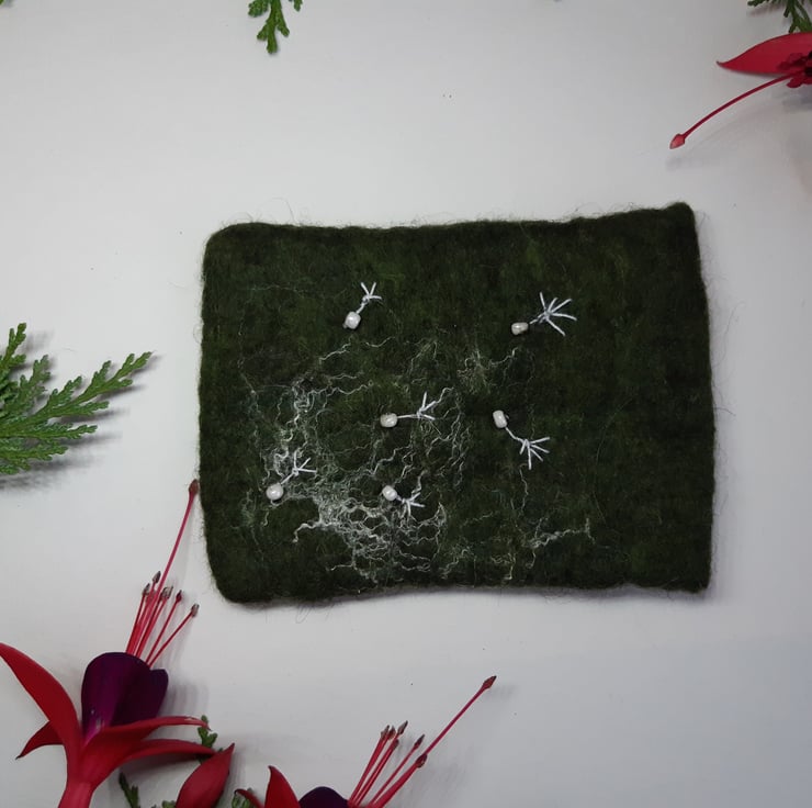 A small felted pouch with a pattern of dandylion seeds floating in the wind. The pattern is created by using a silk fibres in the felt in the background, with stitched and beaded dandylion seeds drifting in the wind. Held closed with a small piece of elastic and a button.