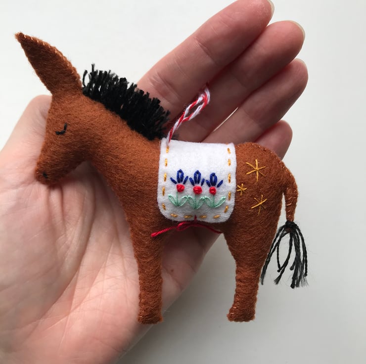 The donkey is 10cm /4” tall from ear tip to hoof. He hangs from a twine loop so can go straight on your Christmas tree. He is made from a shade of wool felt called satchel brown, and has a cream felt blanket over his back.