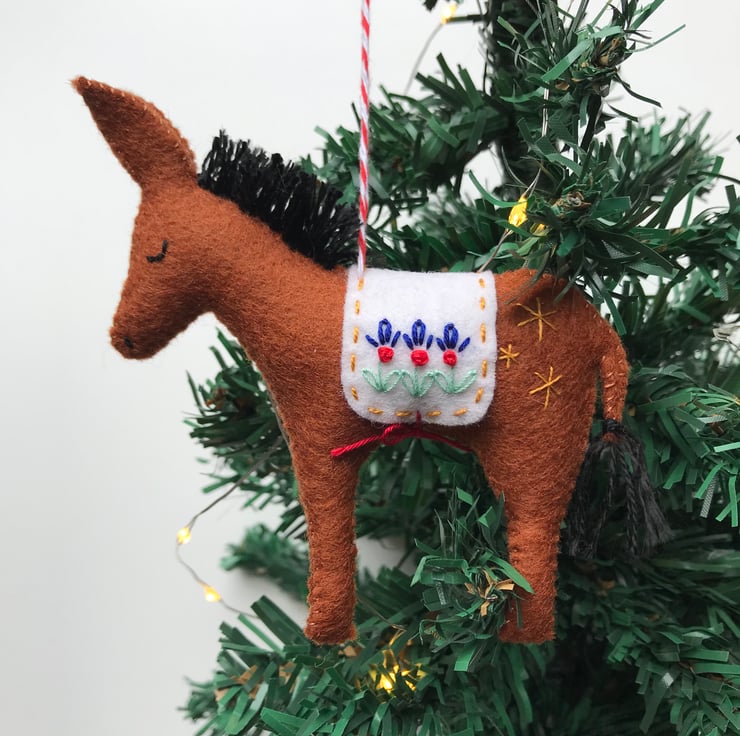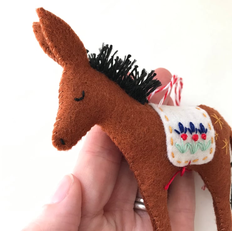 Made in soft 100% wool felt, the donkey is completely stitched by hand and finished with an embroidered blanket. The mane is hand stitched with perlé and wool thread. The donkey has tiny embroidered details, meaning no two are the same. This is a lovely decoration to be treasured for years to come.