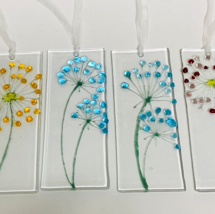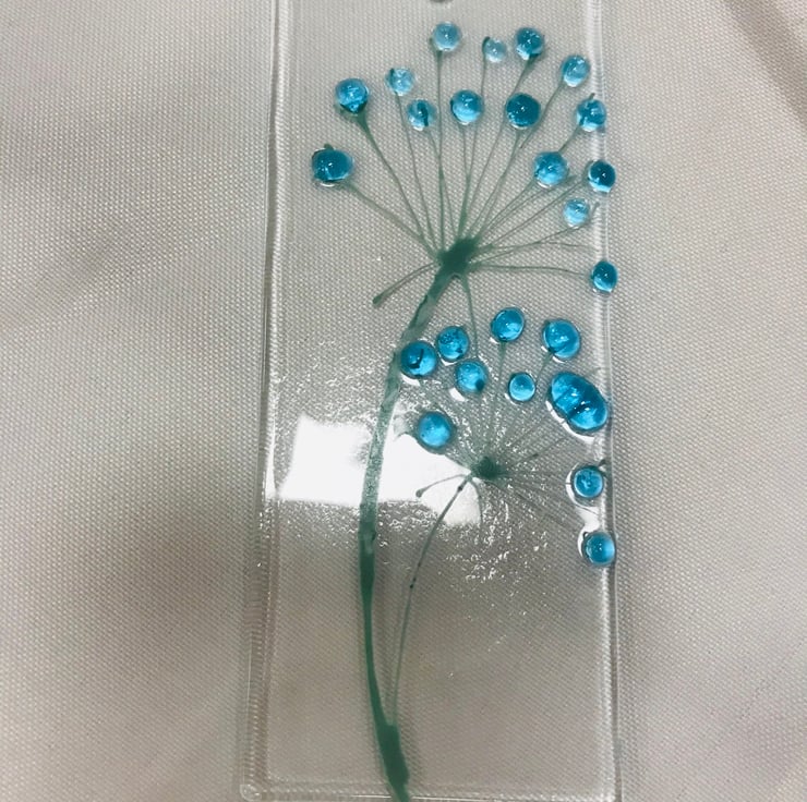 Fused glass delicate agapanthus design . Drilled and ribbon attacched for easy hanging on a door , window or wall . Makes a nice gift