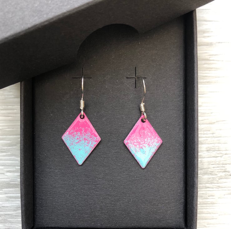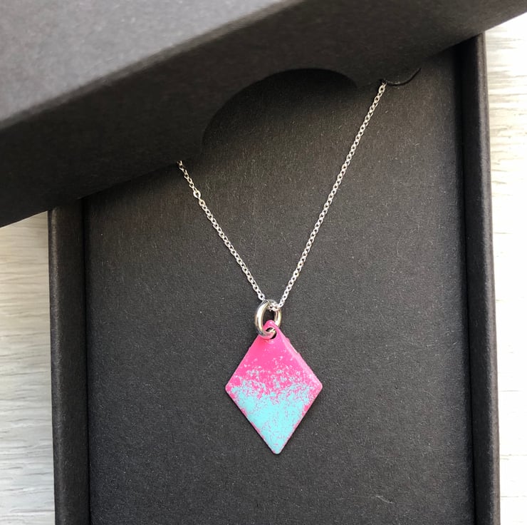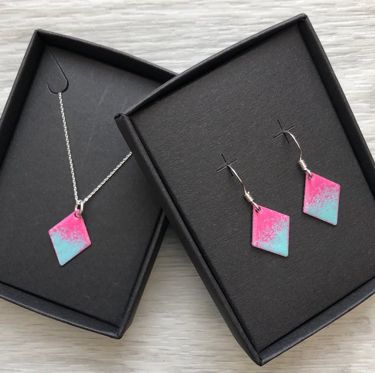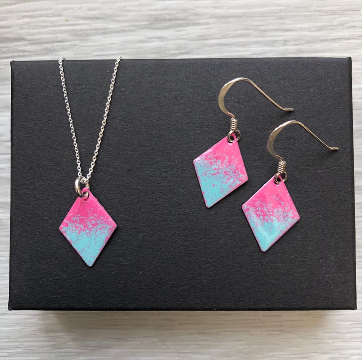 Diamond enamelled necklace & earring sets. Pink & turquoise. Sterling Silver