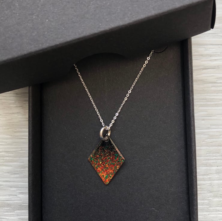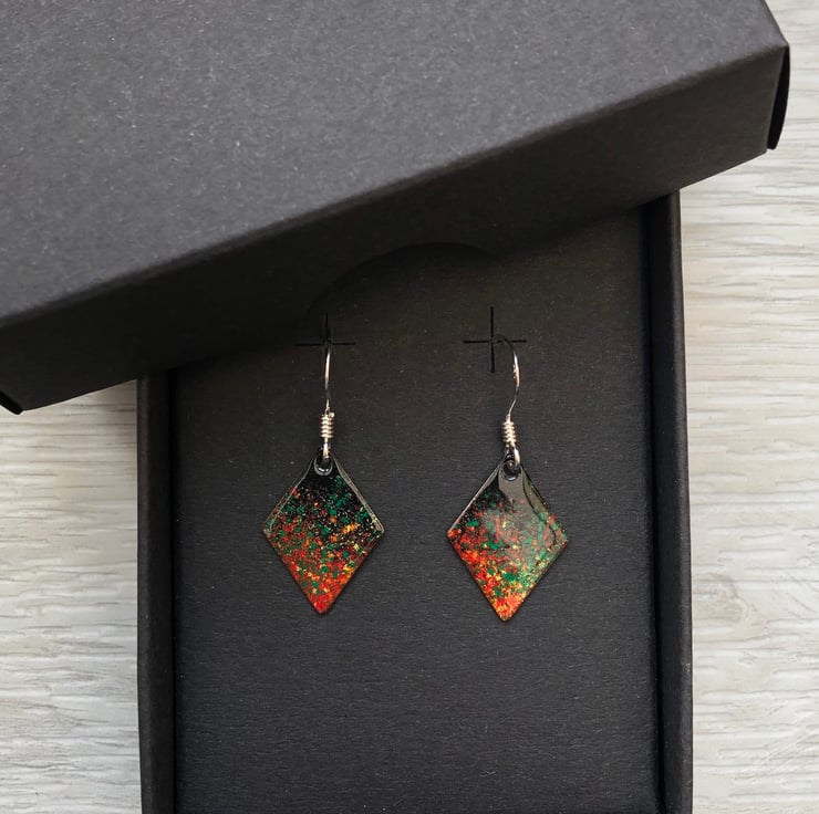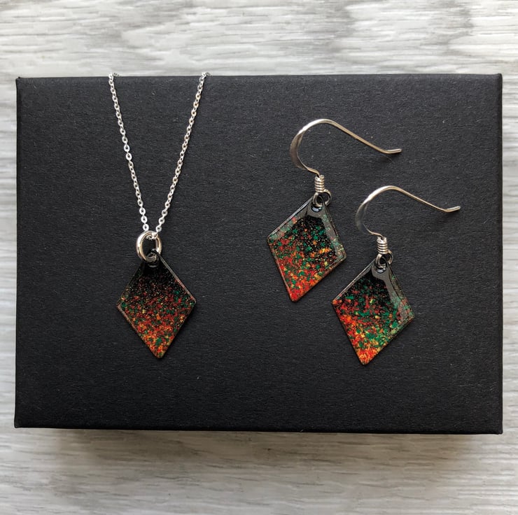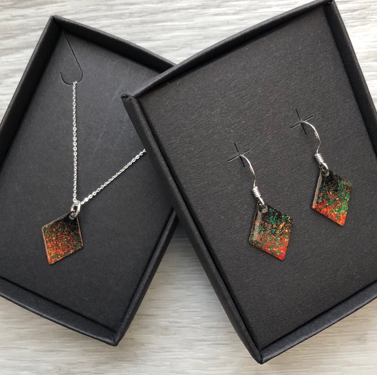 17x12 mm silver tone brass charms have been hand enamelled using cold enamels to make this striking and unique jewellery set.