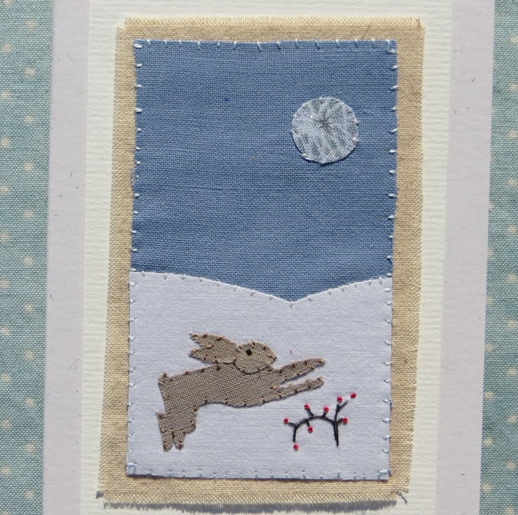 I have always loved hares, and see them in the fields out here on the Lincolnshire marshes. There is mythology around the full moon and hares, which was the inspiration for this miniature hand-stitched textile. It has proved popular as a Christmas design, but for other occasions too. It would look lovely framed.