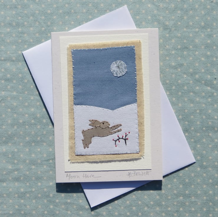 All my cards measure 12 x 9 cm and come with toning recycled paper envelopes in clear protective compostable cornstarch sleeves, no plastic! Each card is signed on the front and my studio stamp is on the back. Cards are made from stout 100% recycled card - blank inside. The title is written below the textile: 'Moon Hare'.