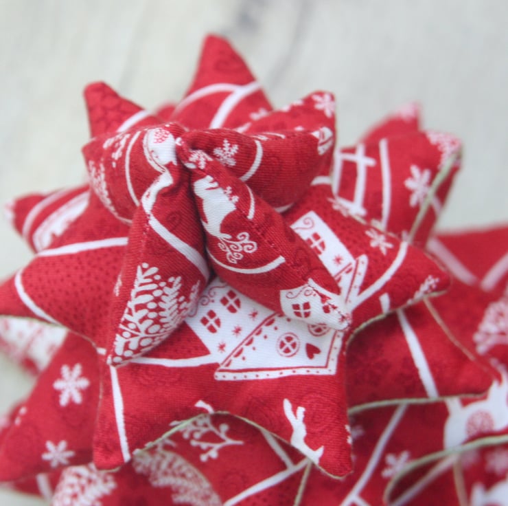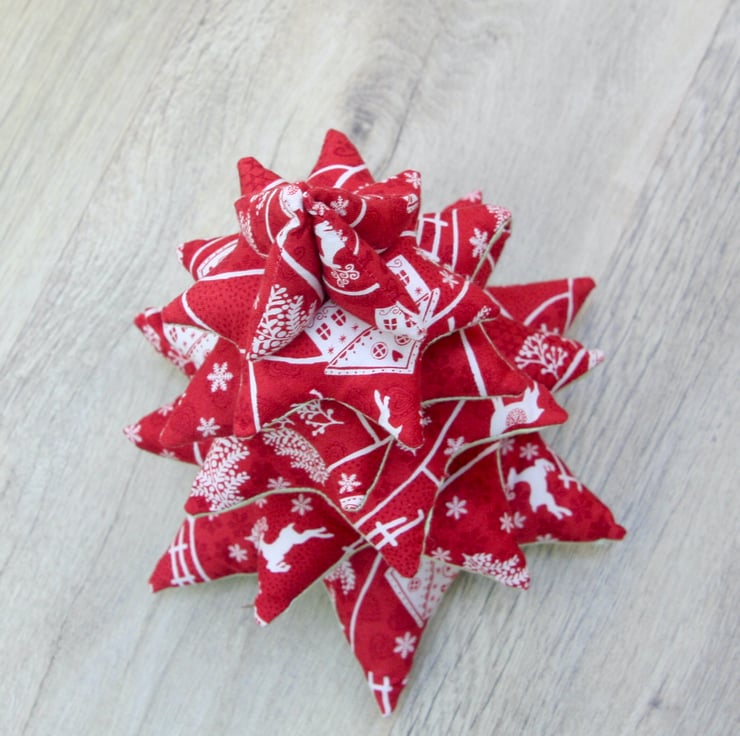 The tops of each section are made from a red cotton with a christmas scandi design and the underside of each section is a pale green cotton. The bottom is secured with a star shaped button to help hold it all together.