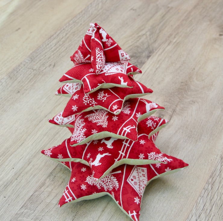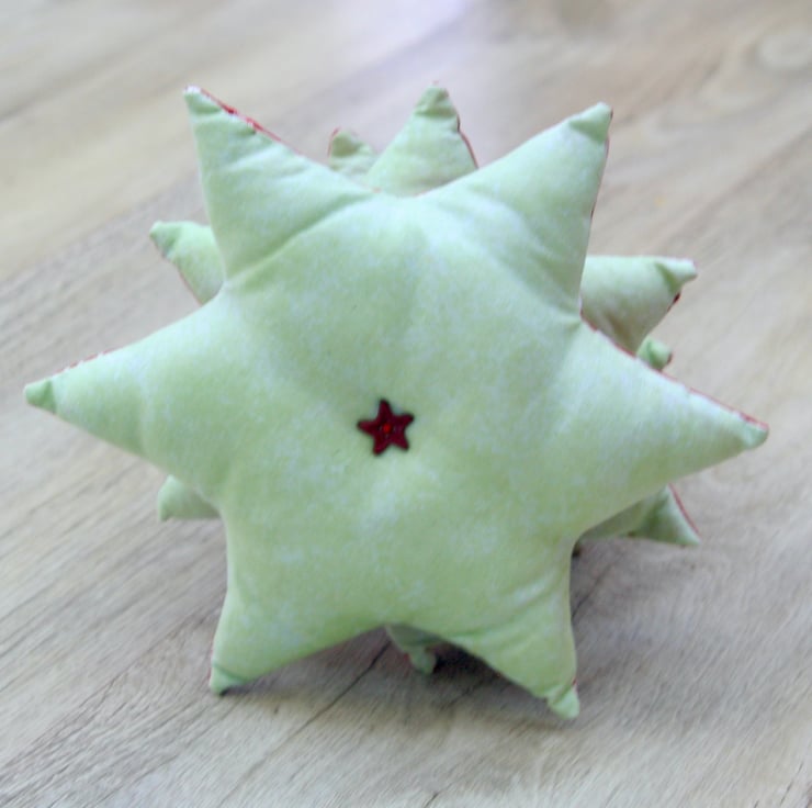 The tree is approximately 22cm tall and approximately 20cm in diameter across at the base. It is made up of 6 sections. Each section is made of 2 star shaped pieces machine sewn together and stuffed with polyester stuffing. The top section is triangular pieces sewn together to form the top of the tree.