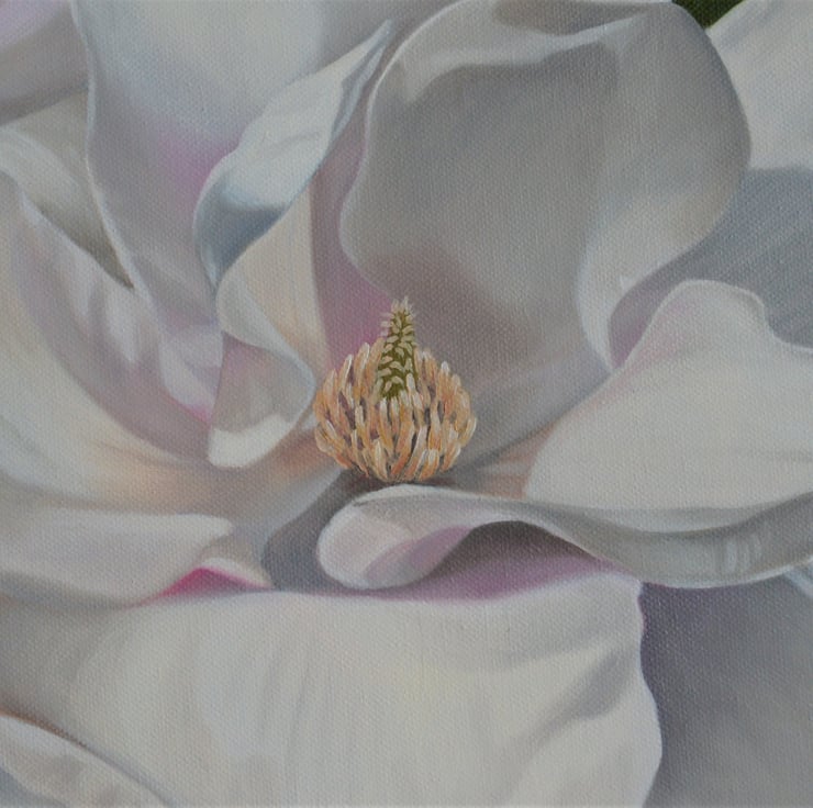 Original oil on canvas painting depicting the centre of a magnolia flower with buds on a dark green background.
