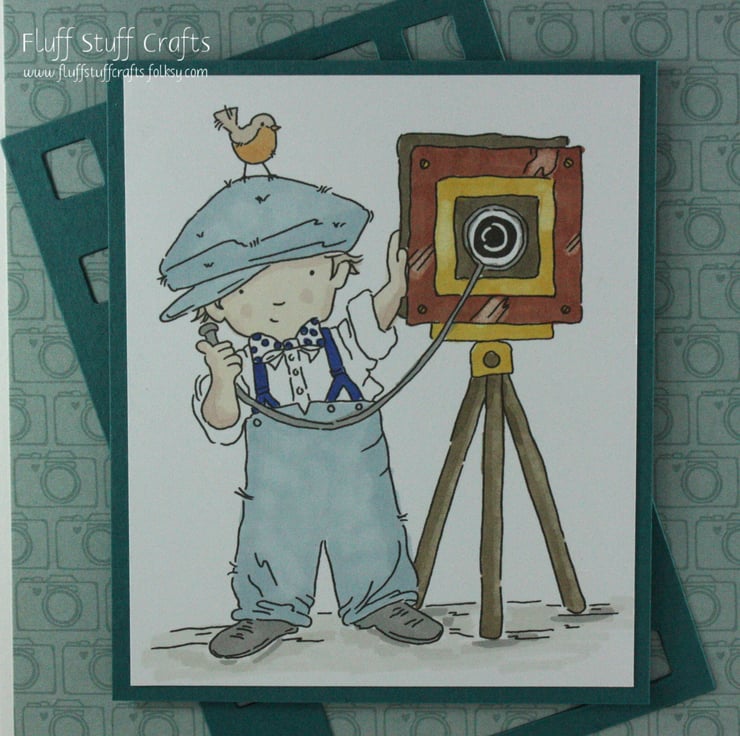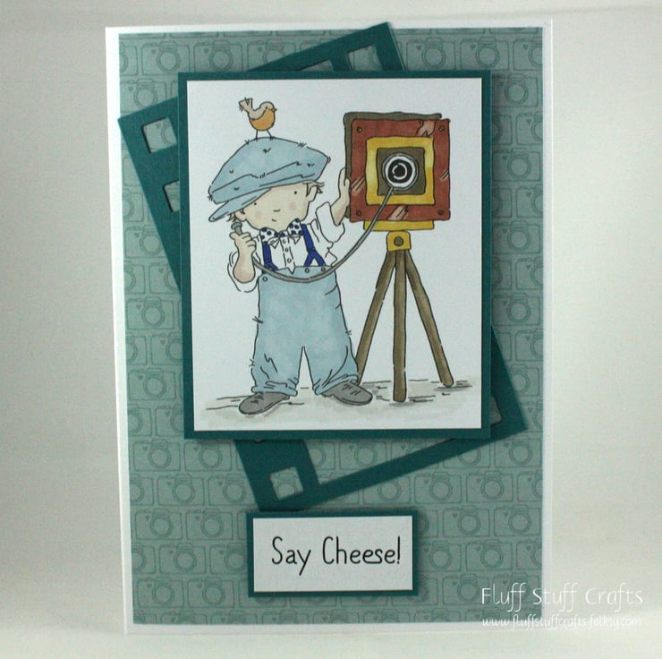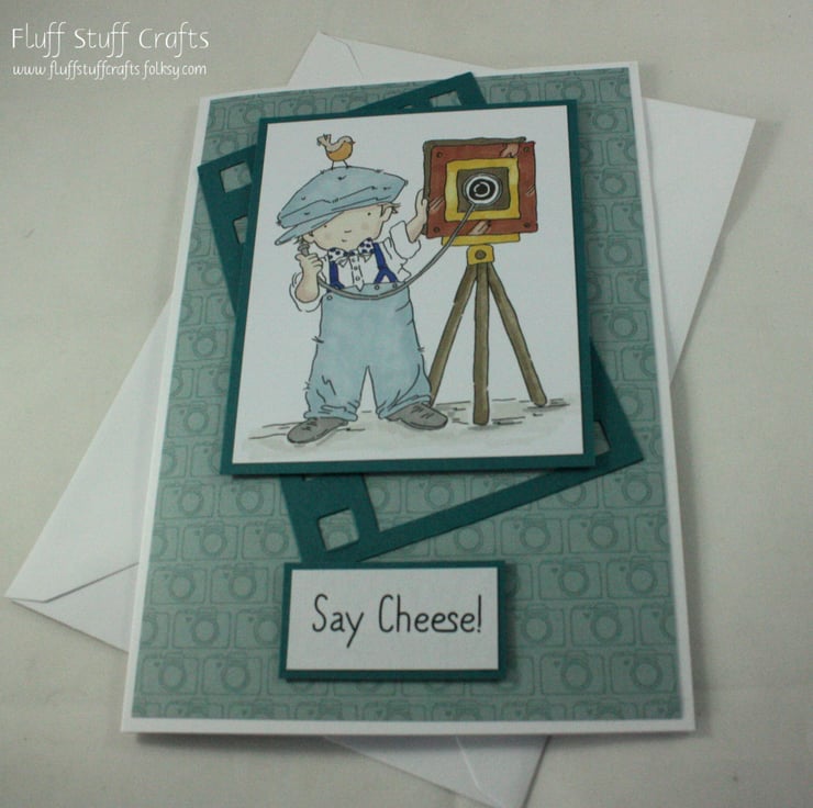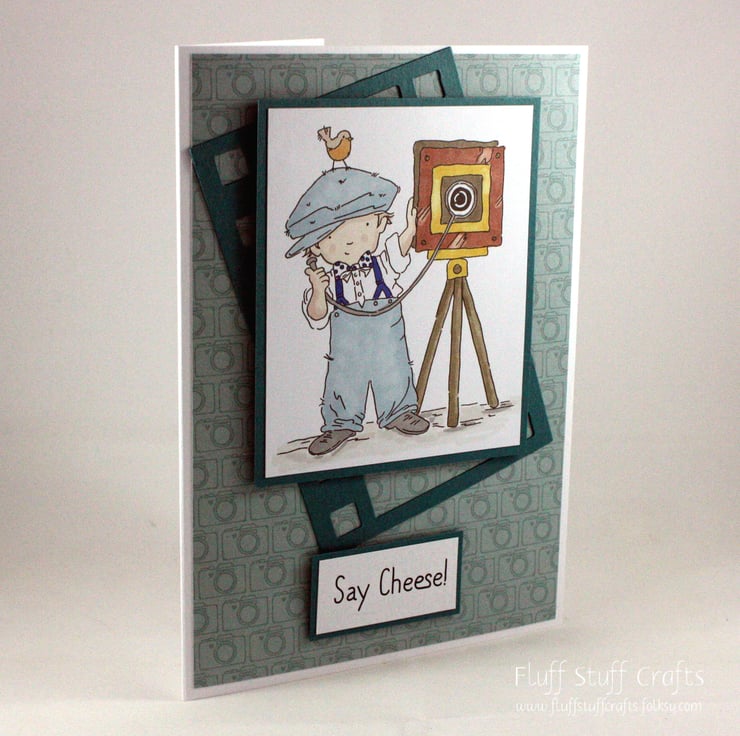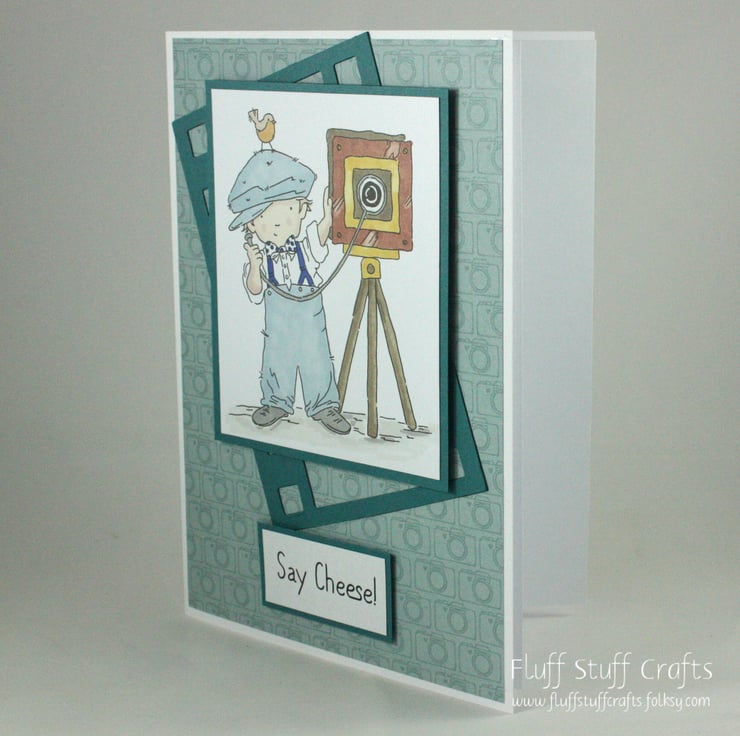 Handmade card suitable for any occasion, but especially birthdays. The card features a hand coloured image of a photographer with his vintage camera. The image and sentiment 'Say Cheese!' have been layered onto teal card over a camera patterned background. A die cut 'photograph negative' has been cut from the same card and lies under the image.