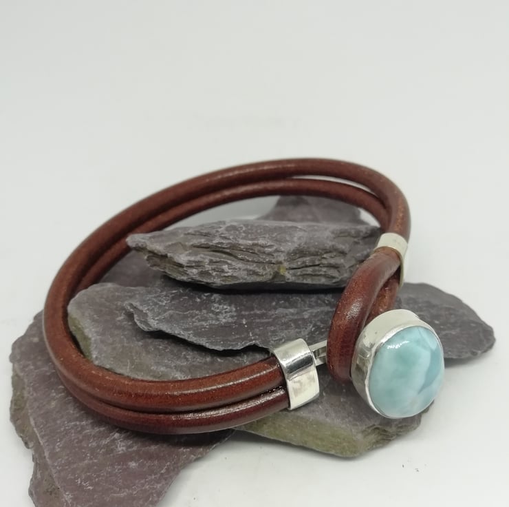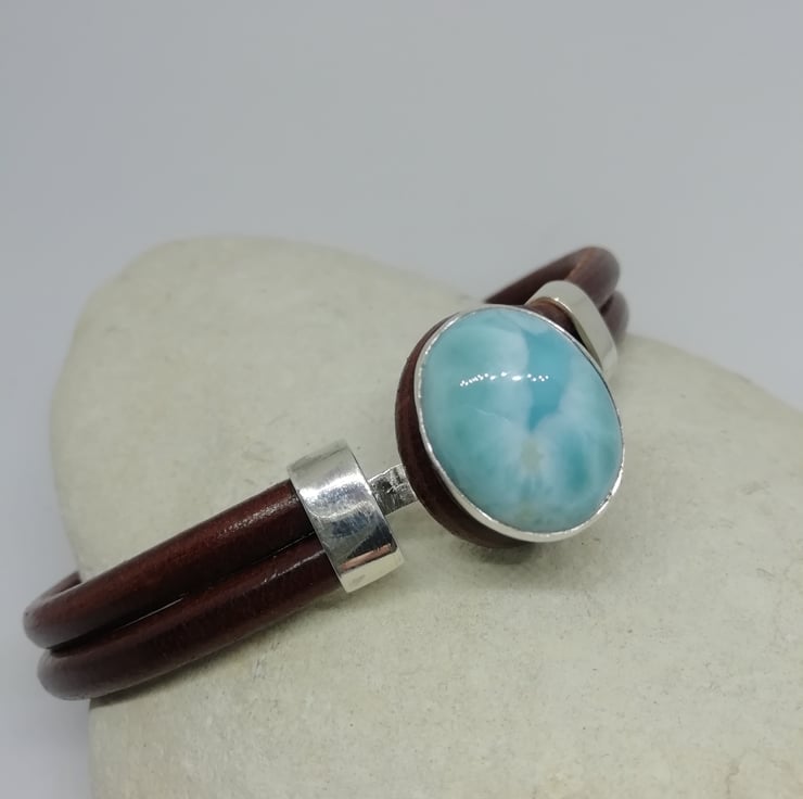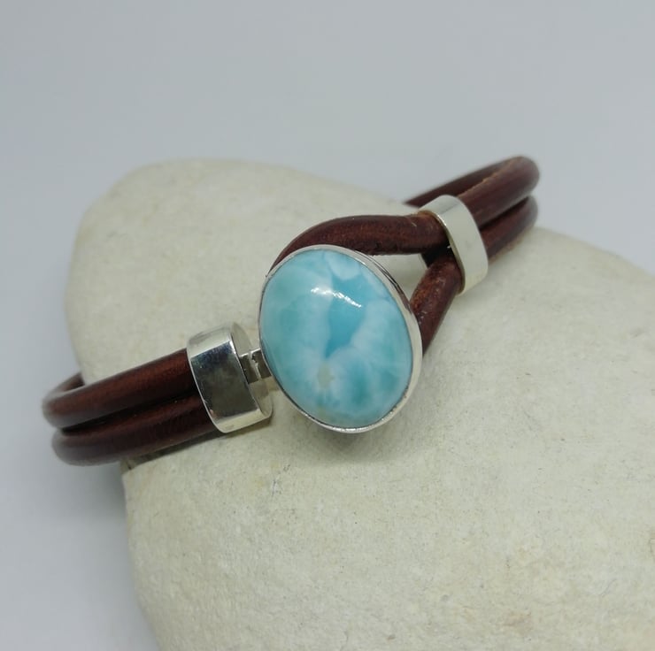 This bracelet is made of a double width of 5mm round tan leather. An oval Larimar cabochon is set in a made to measure sterling silver clasp. The stone is 1.5cm by 2cm and is a aqua colour with streaks of white . Larimar is a stone only found on the Dominican Republic in the Caribbean.