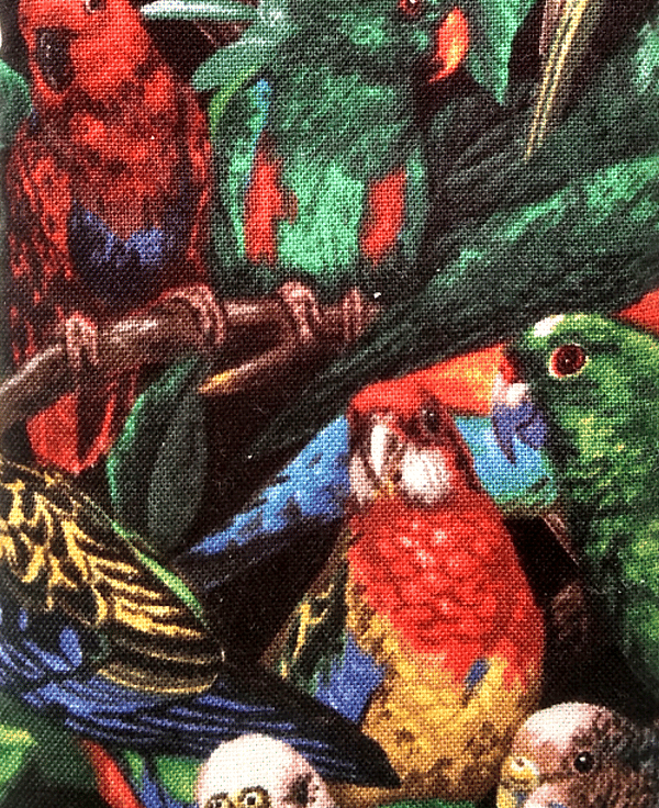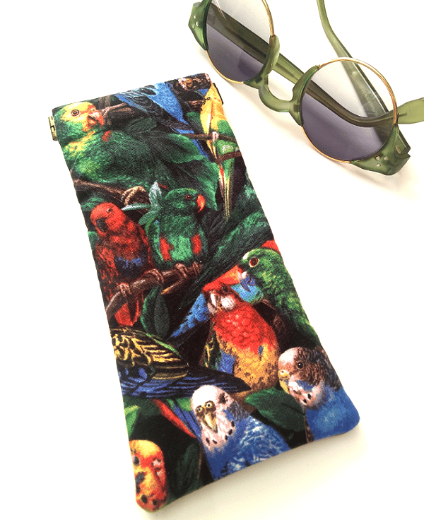 This listing is for a fabric glasses case. The fabric features wild parrots on leafy branches, in particular Eclectus parrots, Rosellas, Amazons and three Budgies along the bottom. This is a lovely gift for a bird lover.